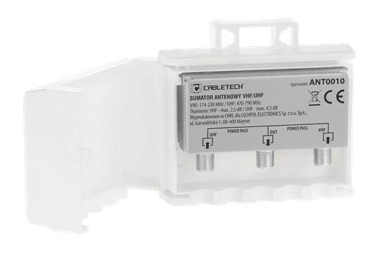 Vhodi: 2 (VHF, UHF) Izhod: 1 Frekvenčno območje: – VHF: 174–230 MHz – UHF: 470–790 MHz Kanali: – VHF: 6–12 – UHF: 21–60 Pas: VHF/UHF Dušenje: – VHF: maks. 2,5 dB: maks.
