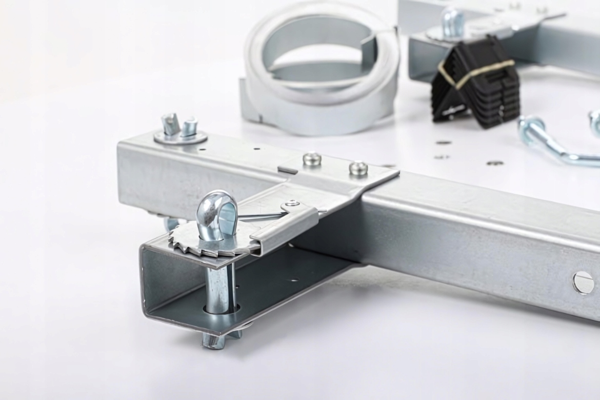 , ki je dodatno zaščiteno z galvanskim cinkom . Zahvaljujoč tej tehnologiji je izdelek izjemno odporen proti rji in vplivom neugodnih atmosferskih dejavnikov , kot so dež, sneg ali močan veter. Trpežna konstrukcija zagotavlja trpežno in zanesljivo pritrditev dolga leta, brez skrbi, da bi se oslabila ali poškodovala . Je ključni element , ki zagotavlja varnost vaše antenske namestitve. Varna pritrditev zahvaljujoč zanesljivemu mehanizmu zaskočke Ključni element te objemke je