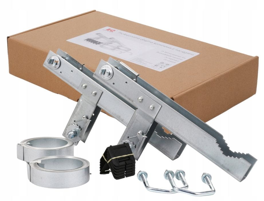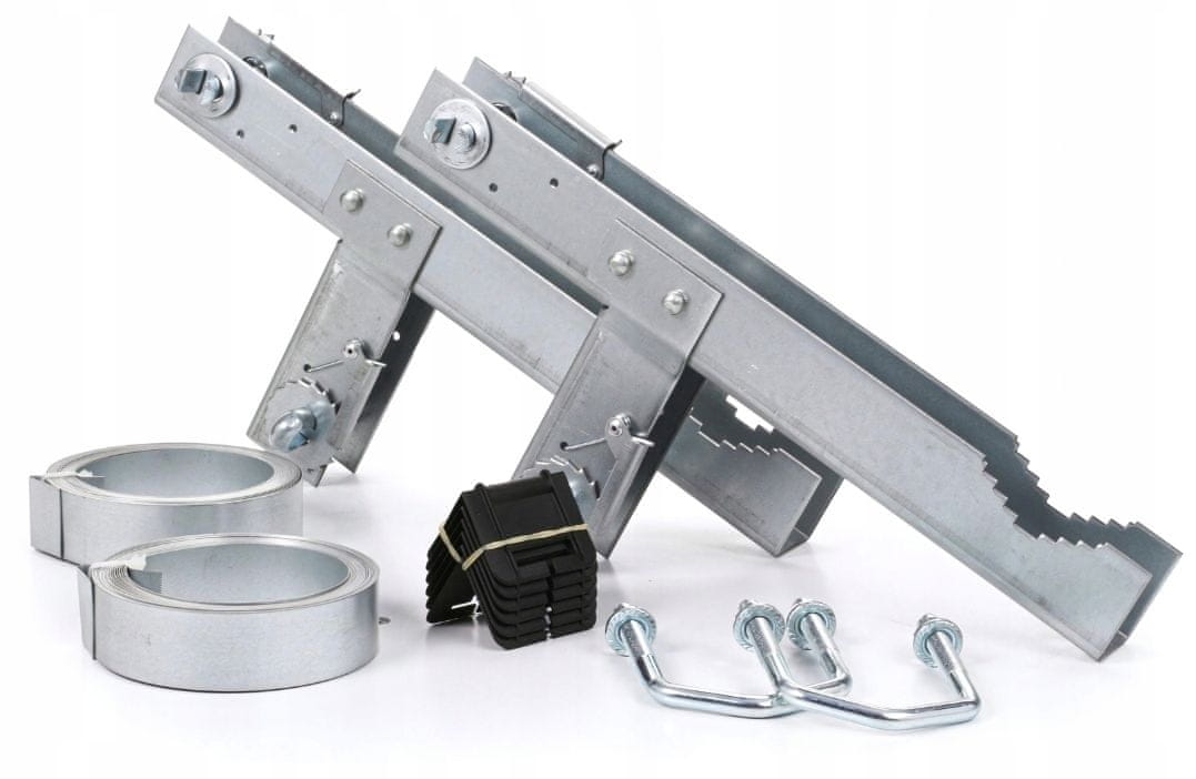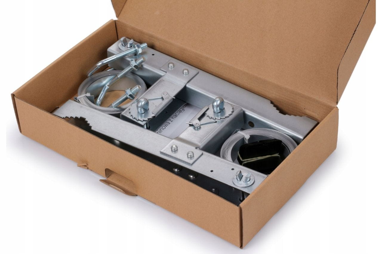 Trdna jeklena konstrukcija, odporna proti koroziji in vremenskim vplivom Varna pritrditev zahvaljujoč zanesljivemu mehanizmu z zaskočko Dolgi 5 m trakovi Idealno za montažo na velike dimnike Univerzalna rešitev za drogove s premerom do 43 mm Izjemno preprosta in hitra montaža brez specializiranega orodja