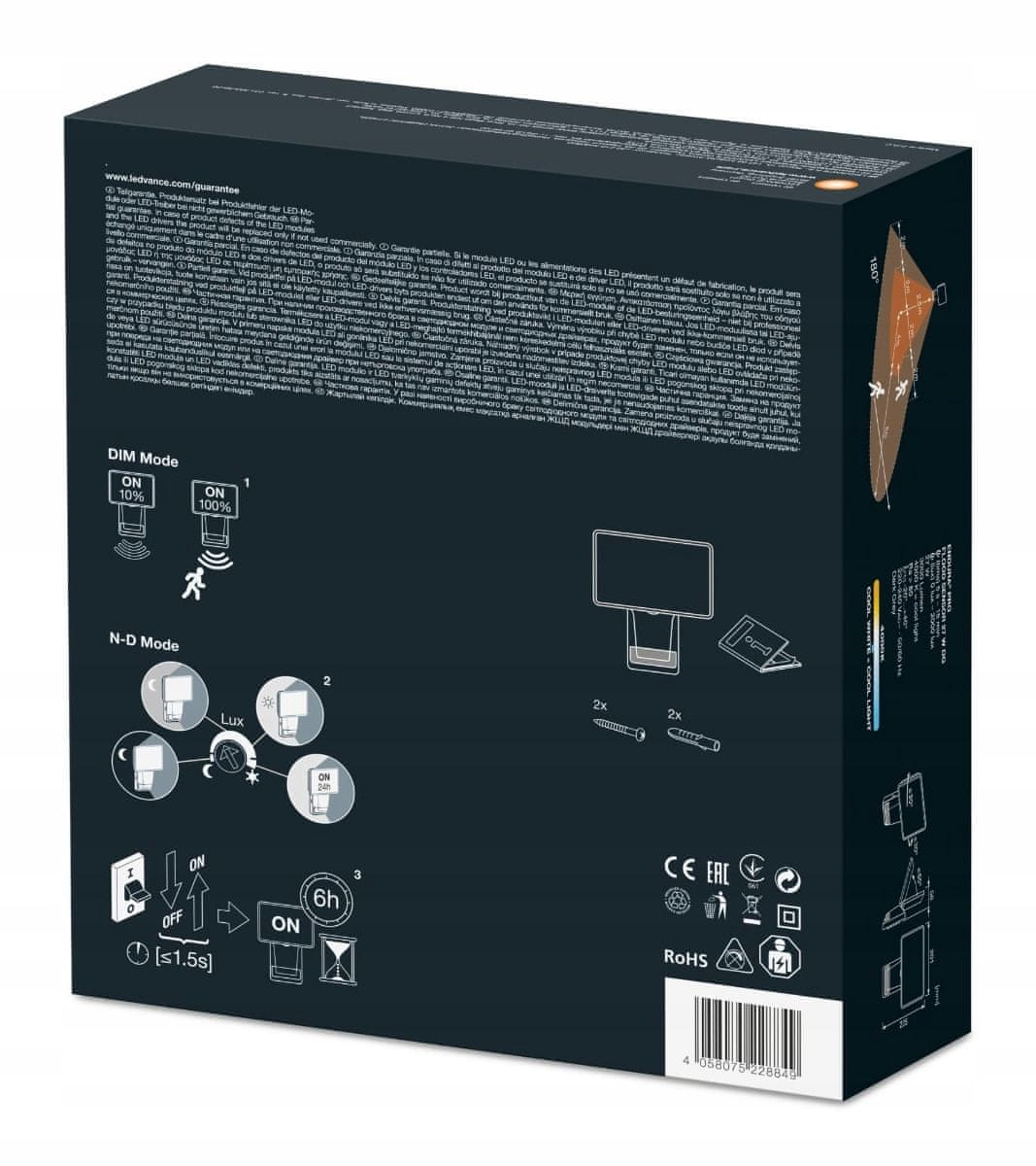 Reflektor LEDVANCE je opremljen s 27W energetsko varčnim svetlobnim virom LED, nevtralno barvo svetlobe z barvno temperaturo 4000K, ki dosega svetlobni tok 3000lm. Reflektor ima senzor gibanja in svetlobe, ki ima kot zaznavanja 180° na razdalji 12 m, prag zaznavanja je mogoče nastaviti v območju 1…1000 luksov, čas pa v območju 2 s…15 min.