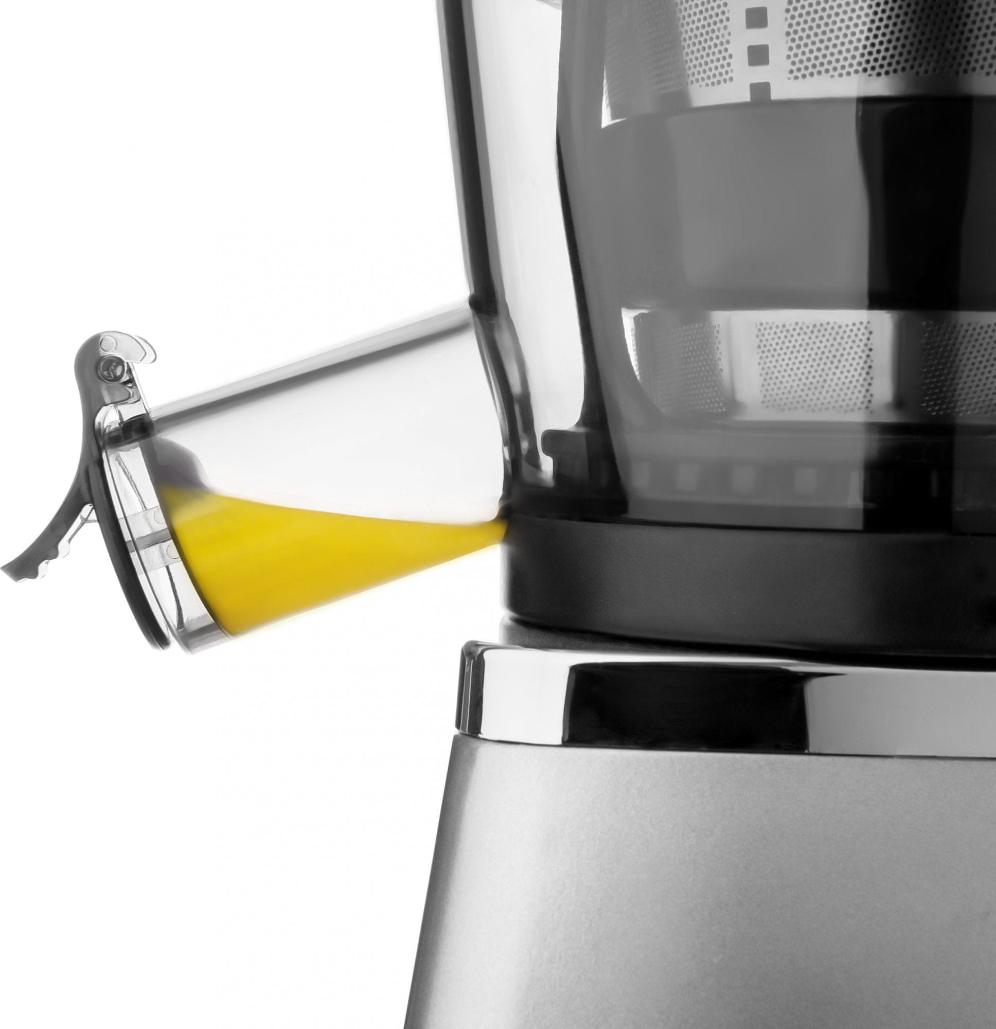 Ta domači pripomoček sok stisne, namesto da bi ga zmlel, in zagotavlja veliko večji izkoristek. Ima veliko polnilno cev za udobno polnjenje ter posode za sokove in pulpo s prostornino 0,8 l iz nenevarnega materiala.