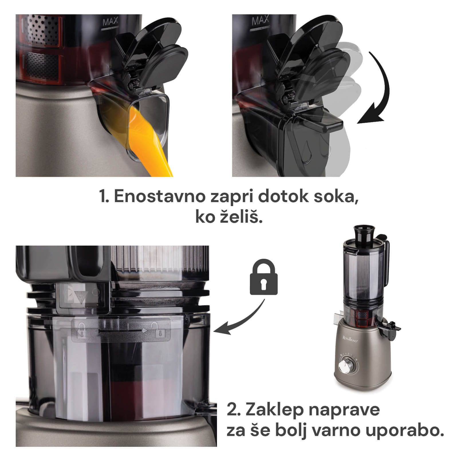 Naprava omogoča enostavno čiščenje, saj se popolnoma razstavi, funkcija vzvratnega vrtenja pa preprečuje zamašitve. Izliv soka ima priročen sistem proti kapljanju, kar poskrbi za čistočo vaše kuhinje.