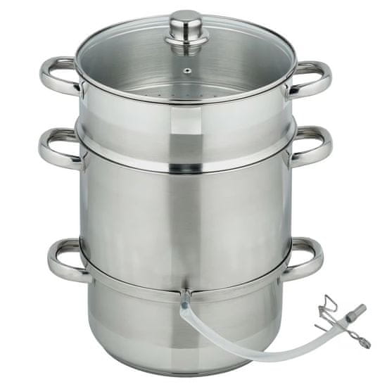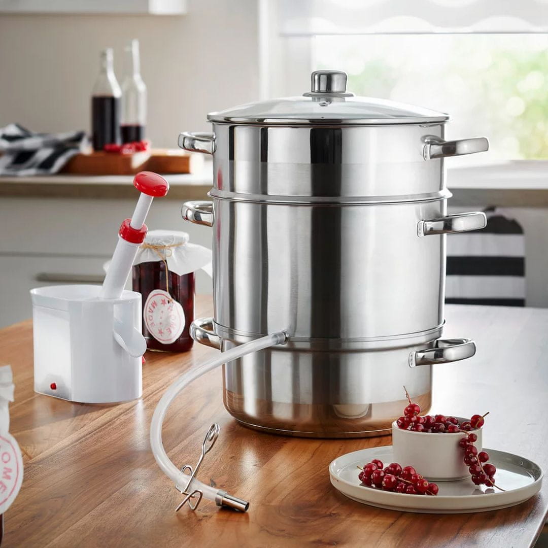 Parni sokovnik Edition Red je idealen za pripravo popolnoma bistrega soka iz sadja ali zelenjave, pripravo želeja, marmelade, džemov, kompota in pireja. Pri ekstrakciji soka iz sadja se ohranijo naravni sladkorji, kisline, hranila, vitamini in edinstvena aroma. Trojno inkapsulirano dno omogoča popolno ekstrakcijo. 3-delna posoda z ročaji je izdelana iz kakovostnega nerjavečega jekla, toplotno odporen steklen pokrov z obodom iz nerjavečega jekla pa zadržuje paro ter omogoča vpogled v posodo. V spodnjo posodo nalijte vodo, v perforirano pa naložite sadje ali zelenjavo (jabolka, jagodičevje, koprive, grozdje …). Perforirana posoda za sadje ima kapaciteto 7 litrov, ki zadošča za približno 6–7 kg sadja. V kolikor vam je všeč bolj sladek okus, dodajte k sadju oz. zelenjavi sladkor. Posodo pokrijte s pokrovom in segrejte vodo. Sokovnik lahko uporabite na vseh kuhalnih površinah (električna, plinska, steklokeramična ali indukcijska plošča). Ko voda zavre, začne para pronicati skozi živilo in pri temperaturi 80 – 90°C popokajo celične membrane (olupek), zaradi česar se začne sproščati sok, ki se zbira v posodi s cevjo (kapaciteta 2,5L), ki je namenjena polnjenju steklenic ali kozarcev. Posoda za vodo mora biti dovolj napolnjena in ves čas enakomerno vreti. Za razliko od navadnega sokovnika je nastali sok segret oz. pasteriziran. Pri tem del vitaminov termično razpade, vendar je obstojnost bistveno daljša, zato ga lahko shranite v steklenice. Cev odprete šele, ko začnete sok pretakati iz posode. V kolikor želite kašast ostanek spremeniti v marmelado ali kompot, morate sadju oz. zelenjavi predhodno odstraniti peclje, liste, peške ali koščice. Sokovnik je primeren za pomivanje v pomivalnem stroju.