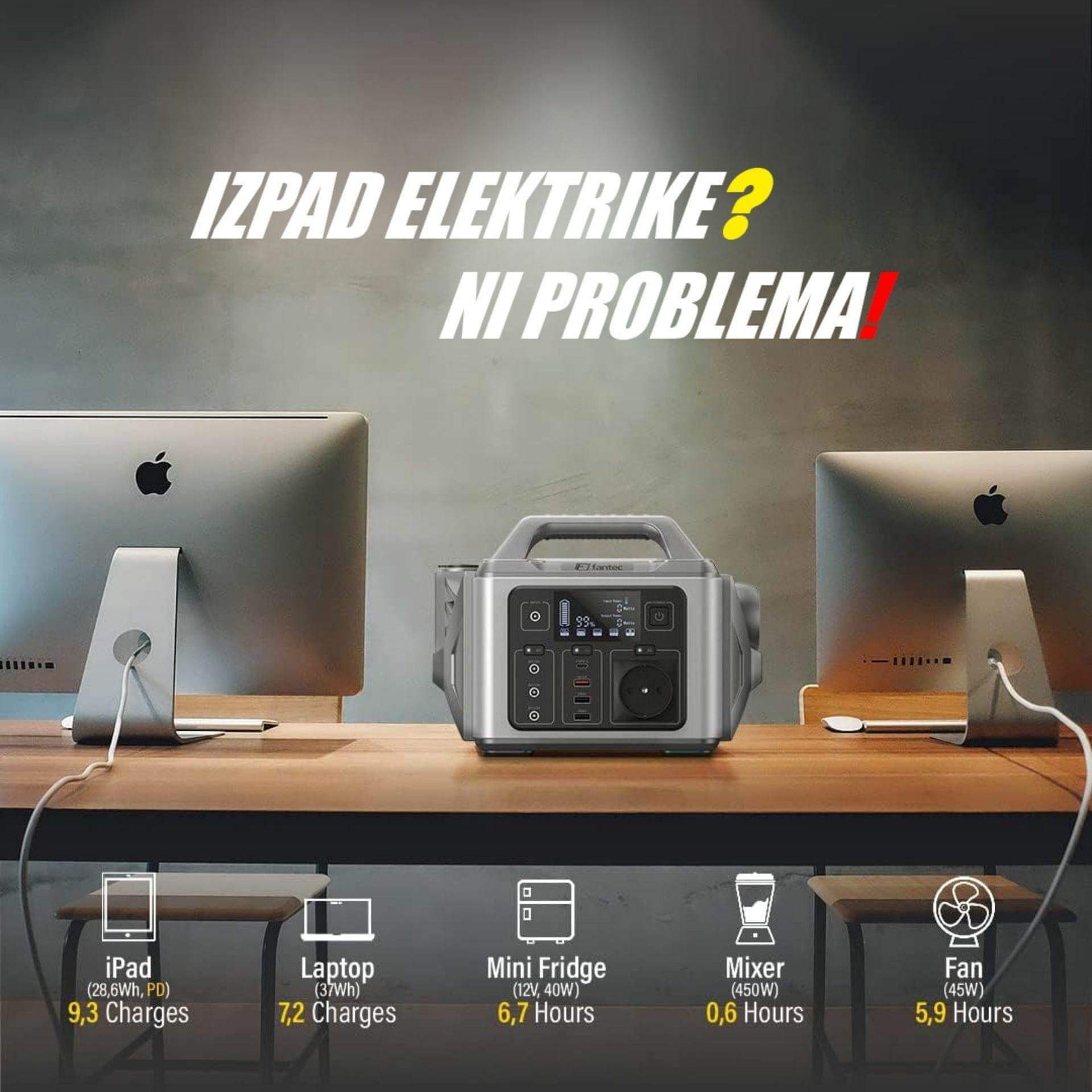 Fantec PGS-300 je prenosna polnilna postaja z 230V AC vtičnico in čisto sinusno napetostjo, primeren za naprave do 300W. Idealen za kampiranje, delavnico ali piknike. Pregleden zaslon prikazuje obremenitev in stanje baterije. Vgrajena 3W LED lučka ima stroboskop in SOS funkcijo. Možnost priklopa solarnega panela.