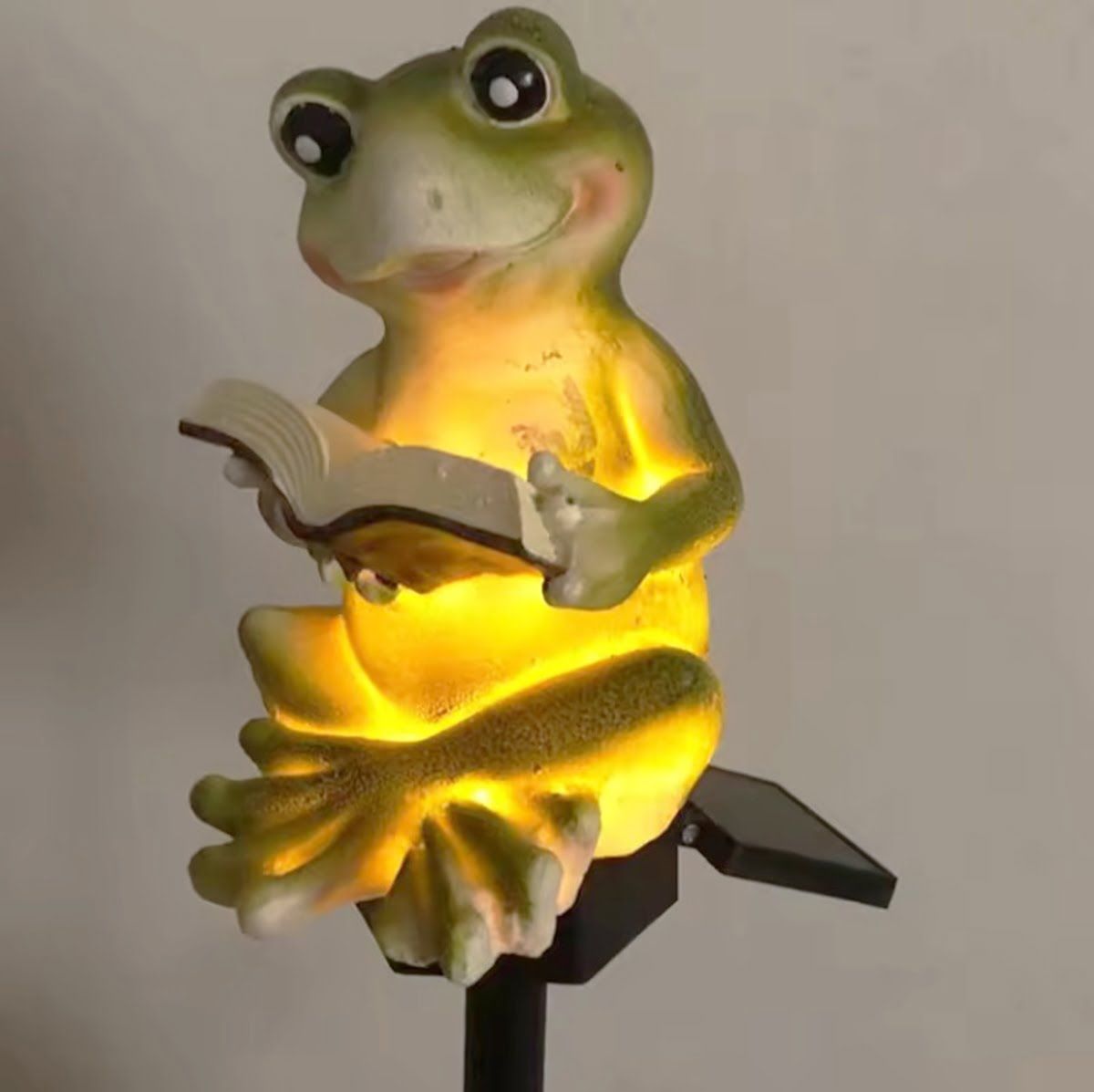 Nenavadna, solarna LED vrtna svetilka v obliki žabe, ki bere knjigo. Popoln dekorativni element. Svetilka se napaja s sončno energijo, ki s pomočjo solarne plošče polni vgrajeno baterijo. Naprava se samodejno vklopi, ko se zmrači (opremljena je s senzorjem mraka), polna baterija pa zadošča za do 8 ur neprekinjenega delovanja. Svetilka ima LED diodo, ki oddaja toplo belo svetlobo. Močna konica omogoča varno in hitro namestitev svetilke v tla, vodotesno ohišje pa zagotavlja nemoteno uporabo ne glede na vremenske razmere.