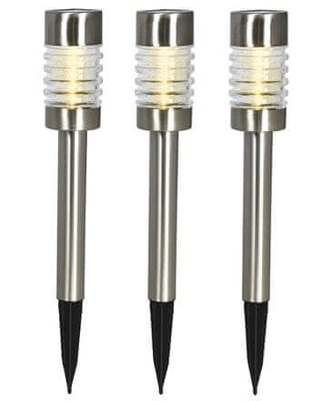 • komplet treh zunanjih LED solarnih svetilk, primernih za osvetlitev celotnega vrta, verande, sprehajalnih poti, paviljonov itd. – zasnovane za vgradnjo v zemljo, pa tudi v cvetlične lončke -.