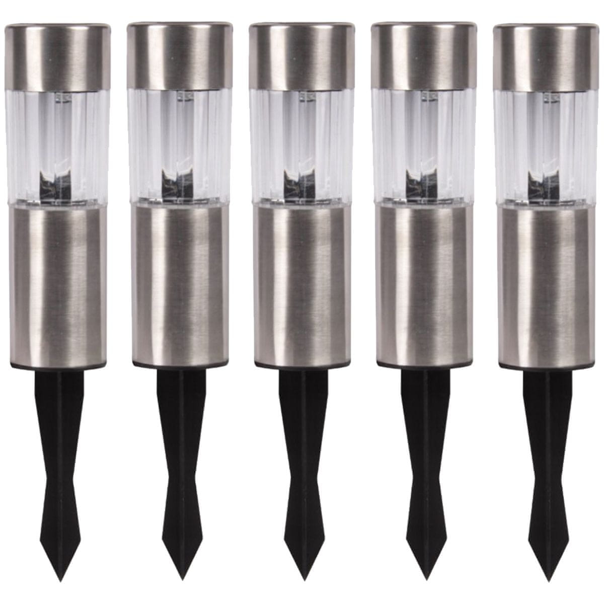 ⭐ Set 5× Solarna LED vrtna svetilka v tleh višine 25cm znanega in priznanega podjetja masterLED. Originalni vir svetlobe s hladno belo barvo (6000K), opremljen s solarno ploščo in senzorjem mraka. Idealen za poudarjeno ali dekorativno osvetlitev na vašem vrtu. Set je sestavljen iz petih vrtnih svetilk.