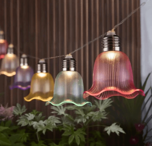je dekorativna solarna svetlobna veriga (girlanda), narejena iz plastike z malimi dekorativnimi zvončki.