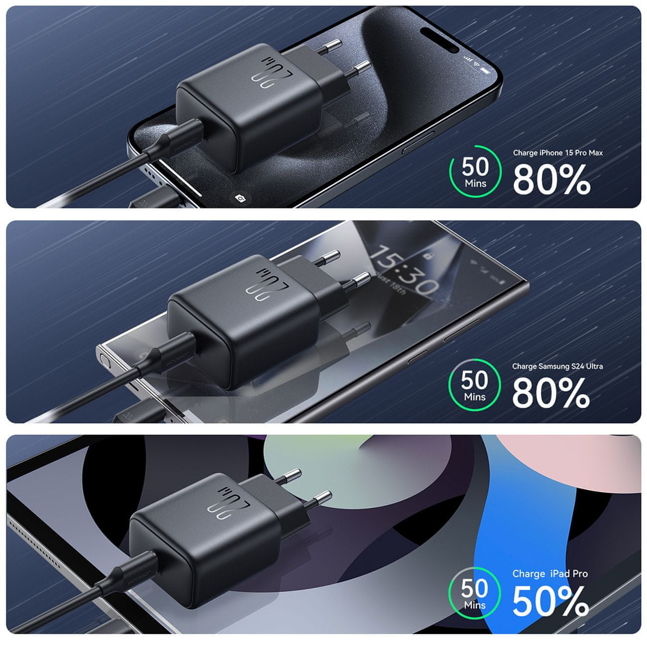 Univerzalna združljivost je ena od glavnih prednosti polnilnika Joyroom JR-TCF20. Ima USB-C vrata, ki so združljiva z mnogimi telefoni in tablicami, kar odpravlja potrebo po več polnilnikih.