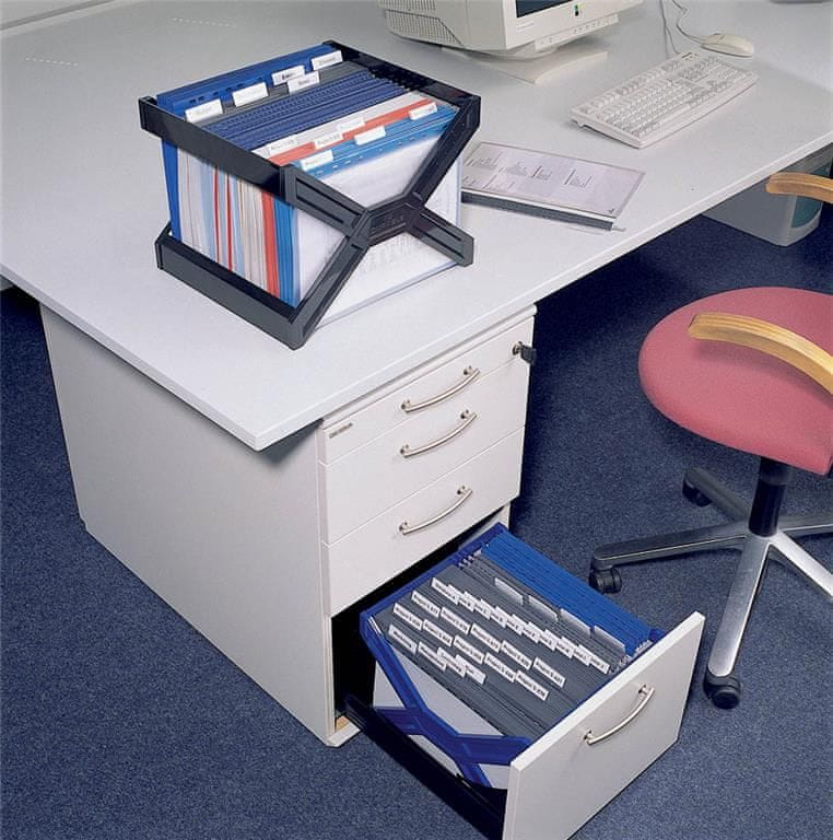 Močno in stabilno stojalo za viseče mape. Lahko in zložljivo. Primerno za vstavljanje v predal ter postavljanje enega na drugega. Izdelano iz polistirena. Velikost 260×362×320 mm. Možnost vstavljanja do 30 visečih map. Celoten opis