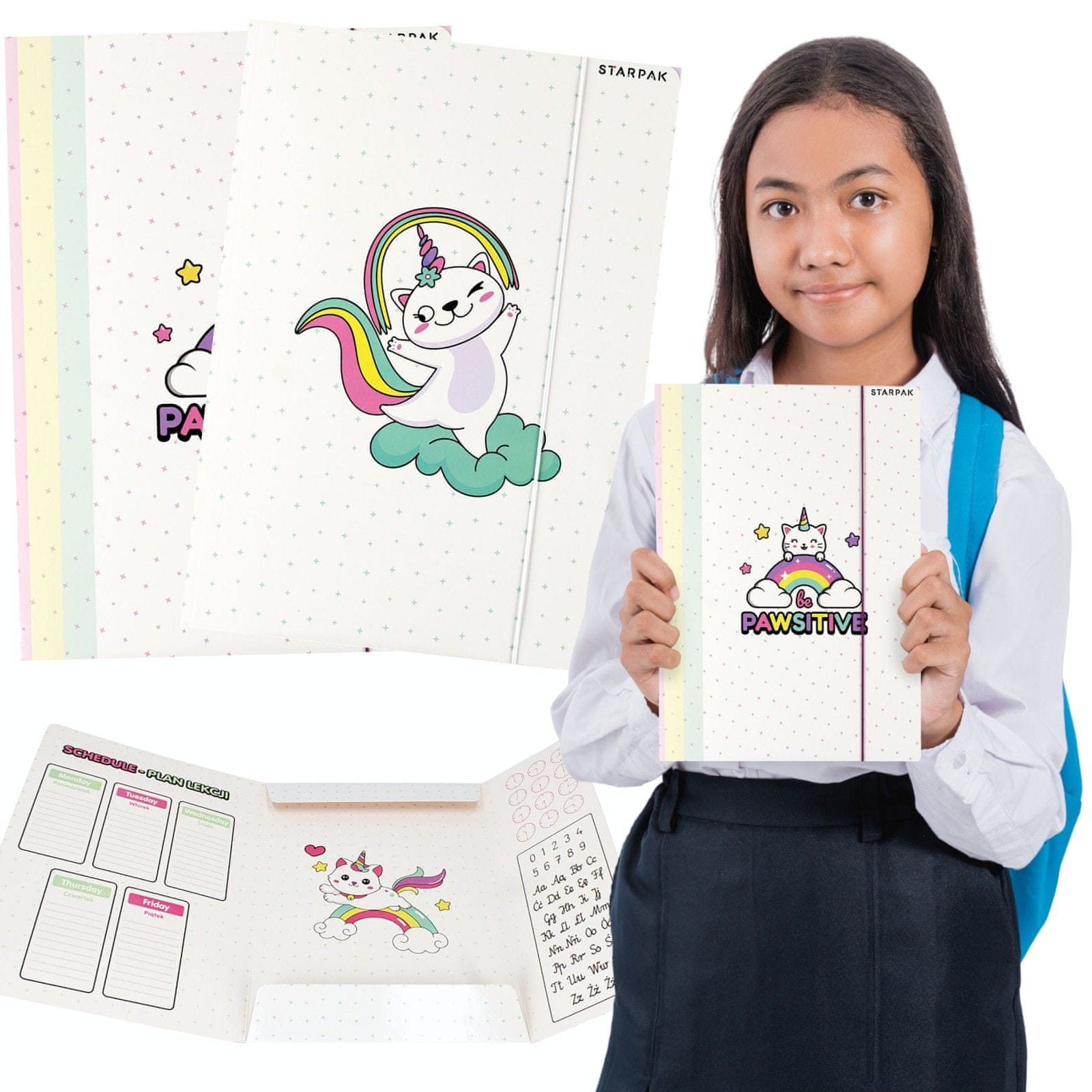 Starpak mapa z gumico „Be Pawsitive“ je barvit in funkcionalen šolski organizator z motivom prikupnega mačka enoroga, ki sedi na mavrici.