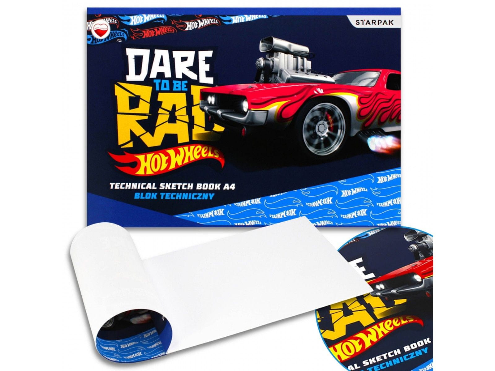 Ovitka bloka je okrašena z impresivno grafiko, ki prikazuje avtomobil Hot Wheels in navdihujoč napis „Dare to be rad“, kar spodbuja k ustvarjalnosti.