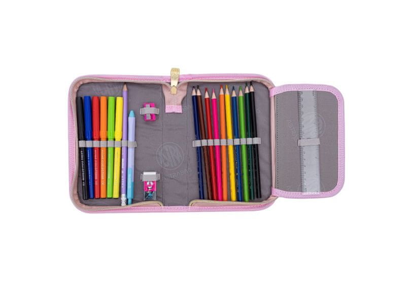 6 barvnih označevalcev, 12 barvic, navaden svinčnik, radirka, ostilec, 15 cm ravnilo in modro pisalo. Vsa orodja so shranjena pod enim priročnim zavihkom, ki se zapenja z zadrgo, kar zagotavlja varno in pregledno shranjevanje.