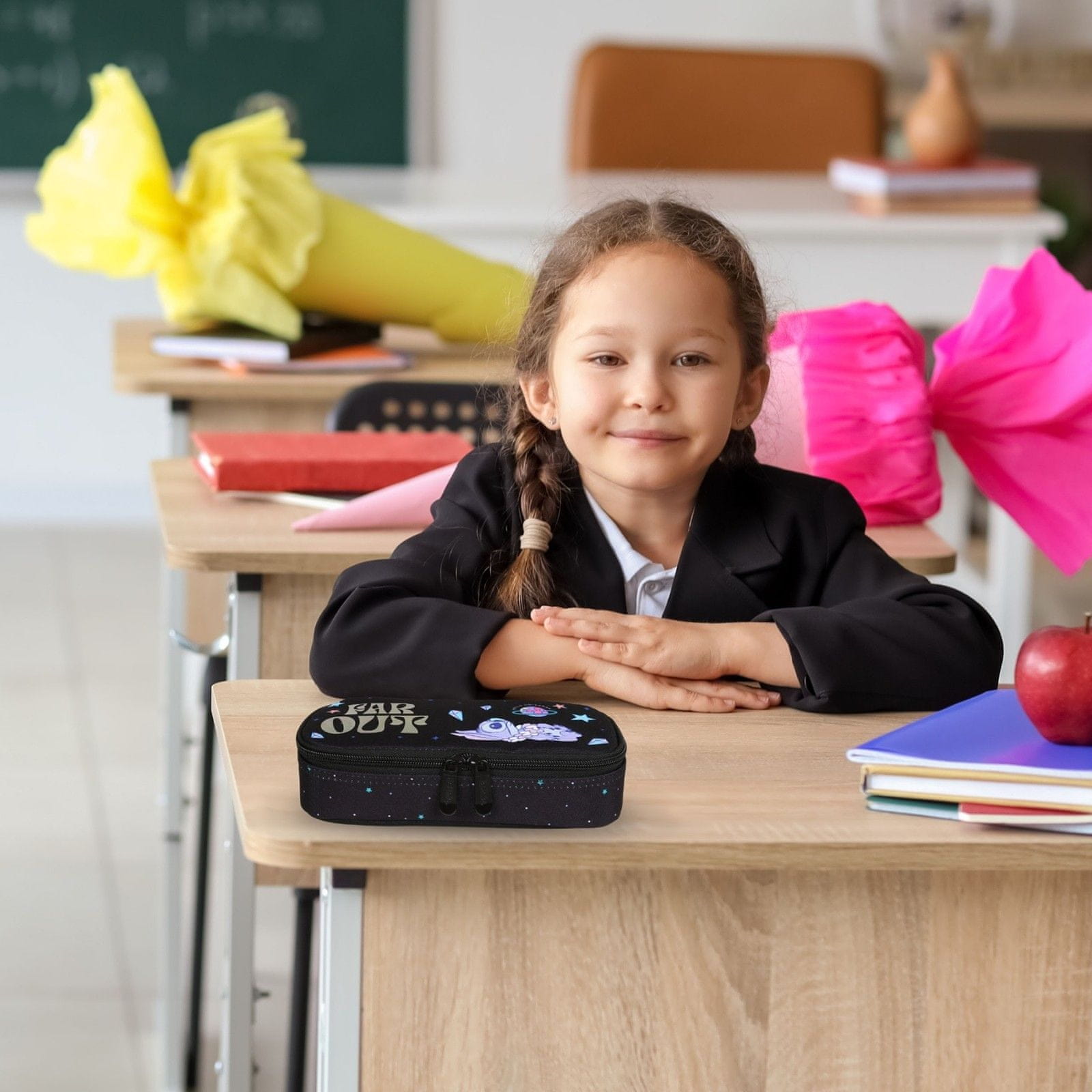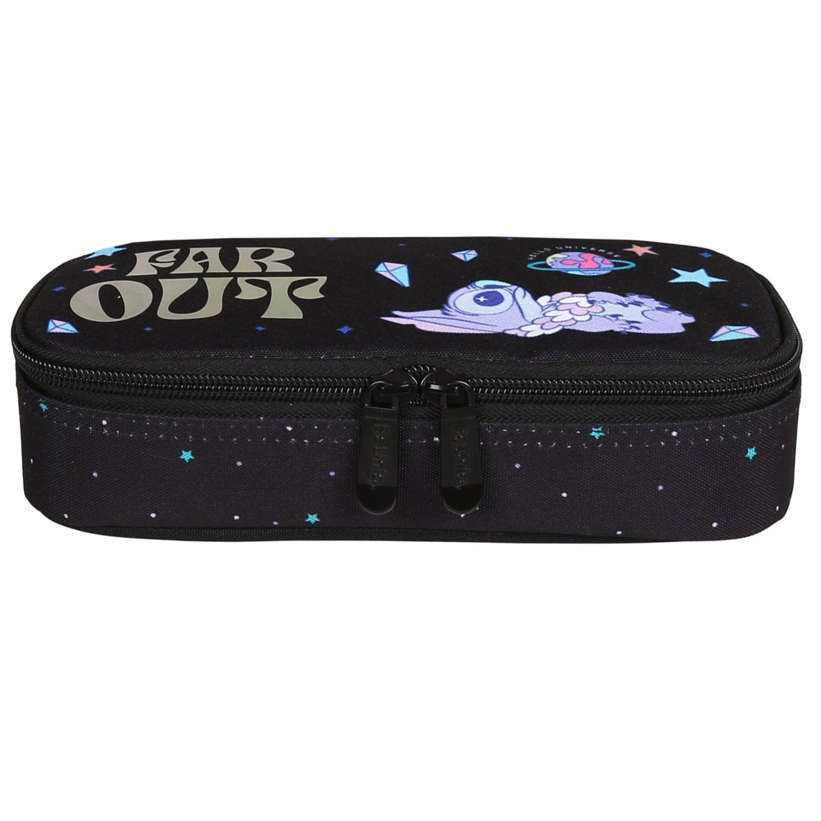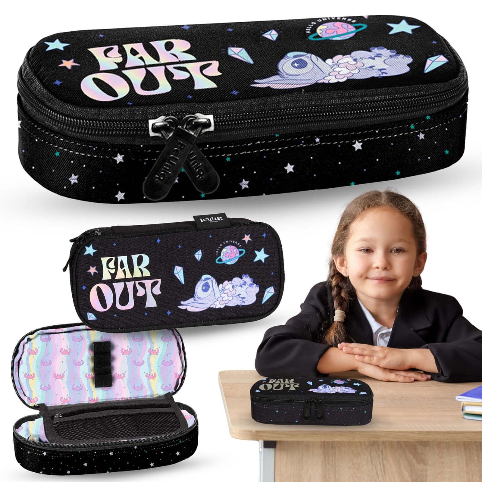 Ovalni peresnik Stitch PASO je praktičen in eleganten šolski pripomoček z vesoljskim pridihom.Opremljen je z eno zadrgo in notranjim zavihkom, kar olajša organizacijo pripomočkov.Črno ozadje, okrašeno z motivom zvezde in grafiko Stitch z napisom „FAR OUT“, mu daje edinstven pridih.Svinčnik je lahek Celoten opis