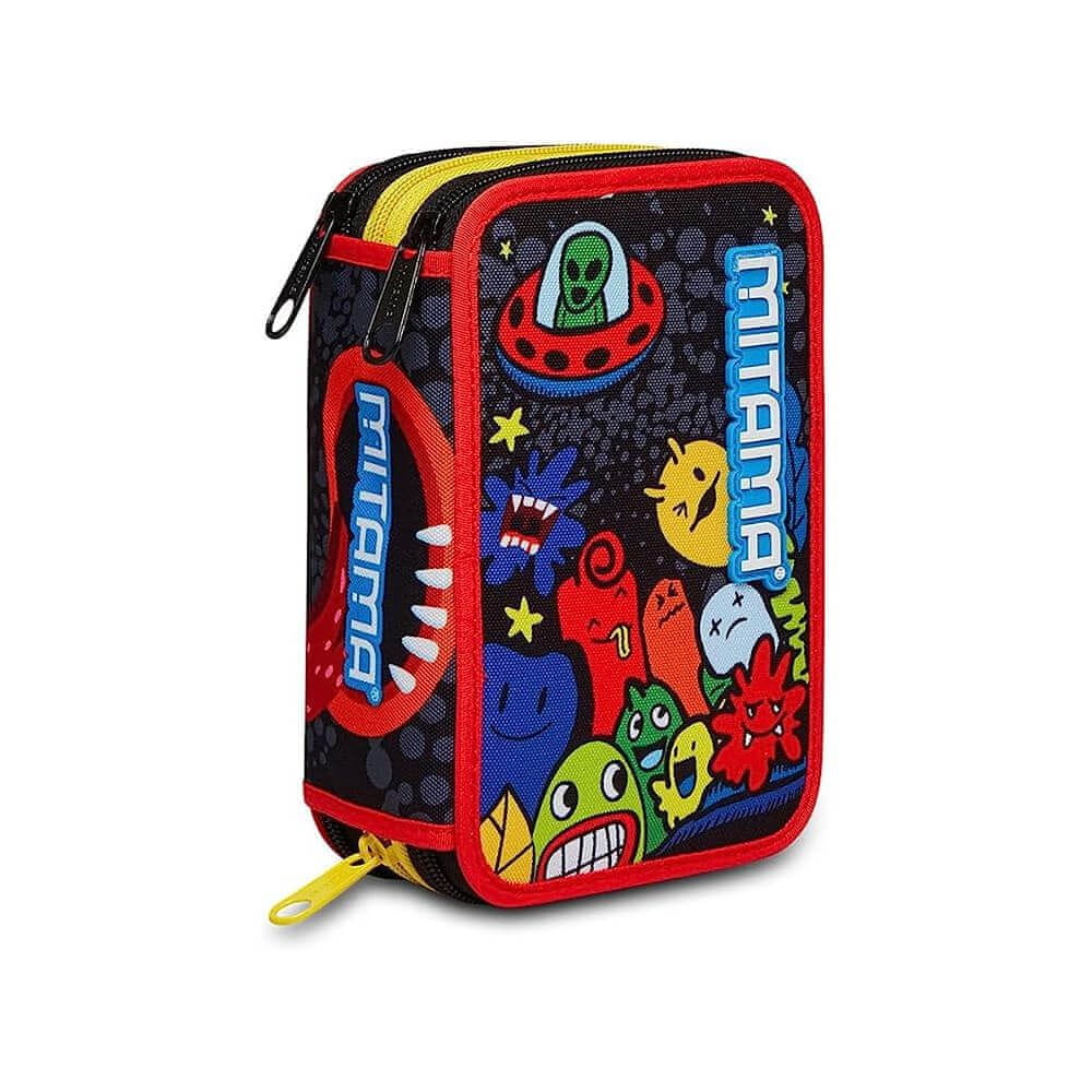 Polna trojna peresnica Pošasti je v kombinaciji črne, rdeče in rumene barve, na sprednji strani pa je tudi motiv prikupnih pošasti in napis „Mitama“. Prav tako pa so zadrge v več barvah, te pa zagotavljajo, da so šolske potrebščine zavarovane v notranjosti.