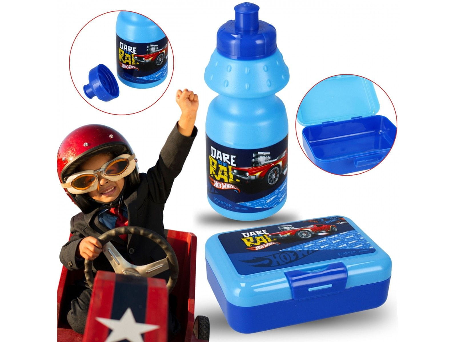 Set vsebuje bidon s prostornino 350 ml in praktično škatlo za malico, oba okrašena z dinamičnimi grafikami Hot Wheels.