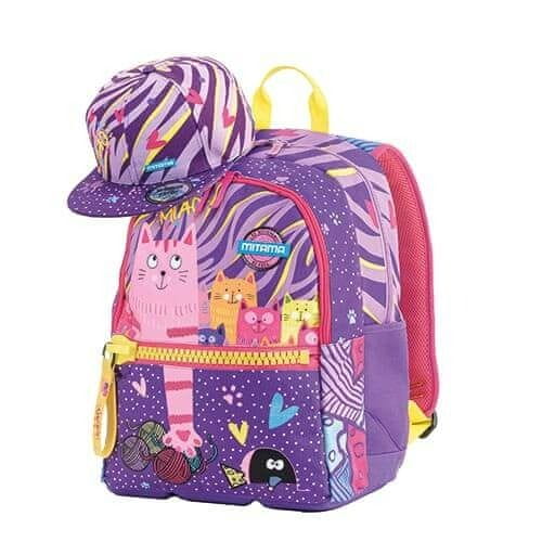 Nahrbtnik odlikuje odlična zmogljivost zaradi dveh ločenih predelov. Prvi, ki je največji je v neposrednem stiku s hrbtom in je namenjen prenosu težjih knjig in slovarjev. Drugi pa je namenjen zvezkom in učbenikom ter shranjevanju osebnih predmetov. Po celotnem hrbtnem delu je dodano oblazinjenje, ki skrbi za maksimalno udobje vašega otroka. Prav tako pa so naramnice široke in oblazinjene, ki dodatno preprečujejo bolečine v hrbtu. , vsi predeli pa so zaprti s kakovostno in debelejšo zadrgo Mitama MegaZip. Nahrbtnik je v vijolični barvi s poslikavo prikupnih muck. Poleg nahrbtnika je v pakiranju tudi kapa s ščitnikom v isti barvi in vzorcu.
