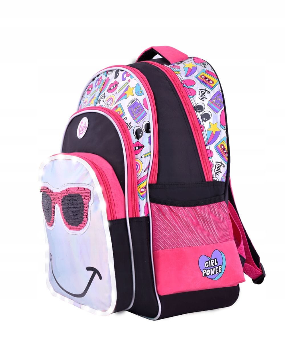 Popoln nahrbtnik za vašega otroka! Izdelan je iz najkakovostnejših materialov in s pozornostjo do vsake podrobnosti. Izvirna oblika, LED luči , motiv očal iz dvostranskih bleščic in edinstvena barvna kombinacija bodo uresničile otrokove sanje. LED luči s tremi načini osvetlitve bodo vašemu otroku zagotovile obilo zabave in veselja, vi pa ste lahko prepričani, da bo vaš otrok na poti v šolo viden.