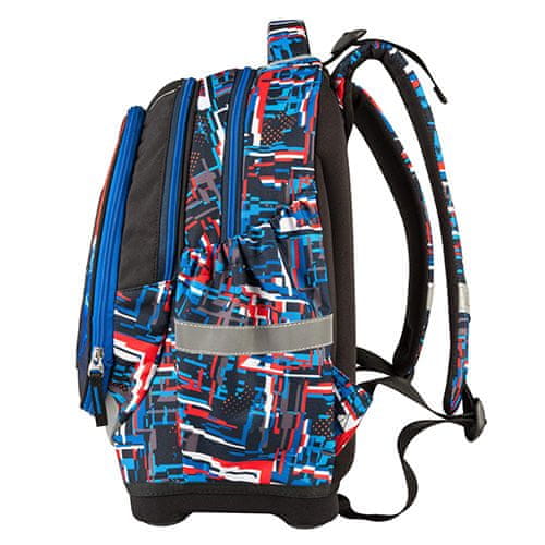 Odlično oblikovan šolski nahrbtnik z notranjim dvema predelkama prostorom, kjer je drugi žep ločen z predelno steno . Prostrani prednji žep s praktičnim organizatorjem in plastičnim karabinom za ključe. Vsi žepi se lahko zaprejo z kakovostno dvostransko zadrgo . Sprednji del nahrbtnika motoristične čelade je odstranljiv in ima zamenljiv motiv .