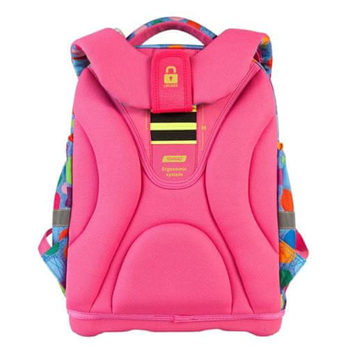 Odlično oblikovan šolski nahrbtnik z notranjim dvema predelkama prostorom, kjer je drugi žep ločen z predelno steno . Prostrani prednji žep s praktičnim organizatorjem in plastičnim karabinom za ključe. Vsi žepi se lahko zaprejo z kakovostno dvostransko zadrgo . Sprednji del nahrbtnika z obarvanimi polka pikami je odstranljiv in ima zamenljiv motiv .