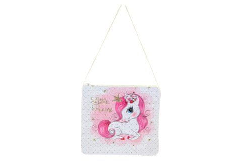 Tkaninska torbica s simpatičnim motivom samoroga. Sprednja stran s sliko iz sijaja (usnje). Pakirano v torbici. Dimenzije 24×22 cm. Dolžina traku približno 60 cm x 2. Izdelek ni igrača, namenjen je za dekorativne namene.