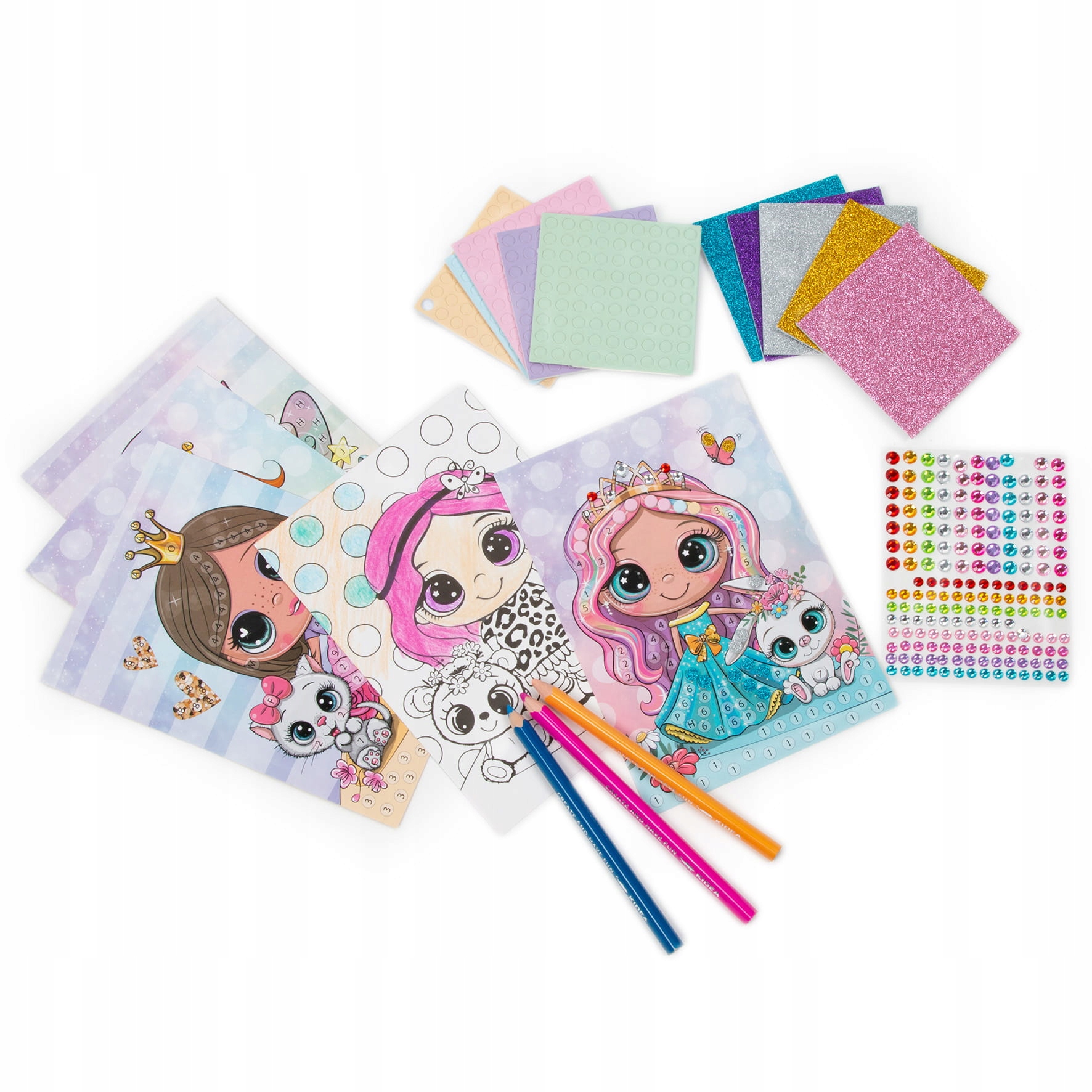 Komplet za ustvarjanje mozaikov in pobarvank vsebuje pet dvostranskih listov z mozaiki na eni strani in pobarvankami na drugi. Slike vas popeljejo v čarobni svet vil, poln čudovitih dežel in ljubkih živali.