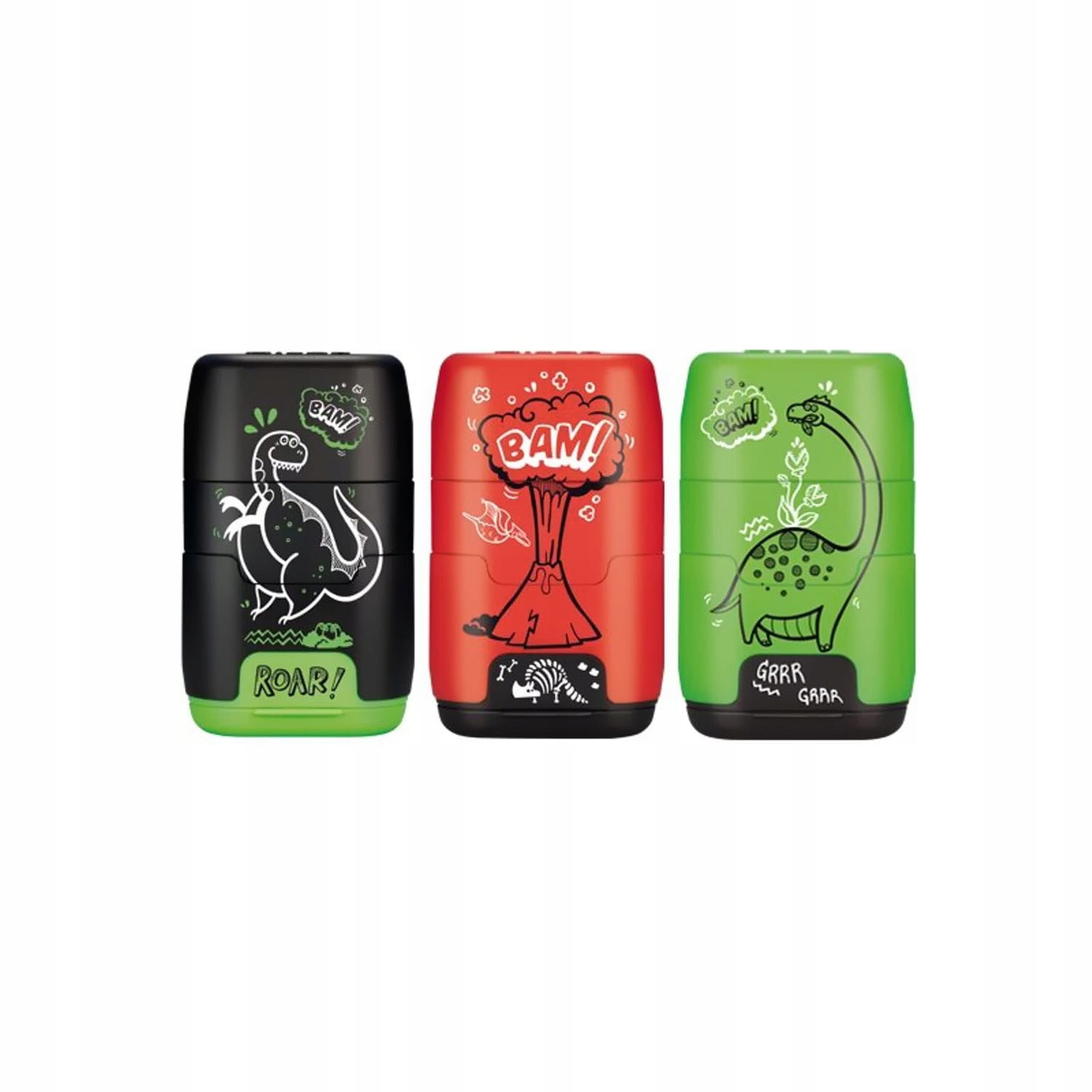 Fantastična kombinacija radirke in šilčka v enem. Na eni strani dvojni šilček za tanke in debele barvice ter svinčnike. Na drugi strani mehka radirka iz sintetične gume, na sredini pa posoda za ostanke papirja. Vsi v živahnih barvah in moderni obliki, ki spominja na kolekcijo PRED MILIJONI LETI. Imajo ostra in trpežna rezila iz ogljikovega jekla, zaradi česar so idealni za vse vrste svinčnikov. Imajo varnostni sistem rezil, ki preprečuje, da bi se rezilo ločilo od ohišja šilčka. Popolni za šolsko uporabo.