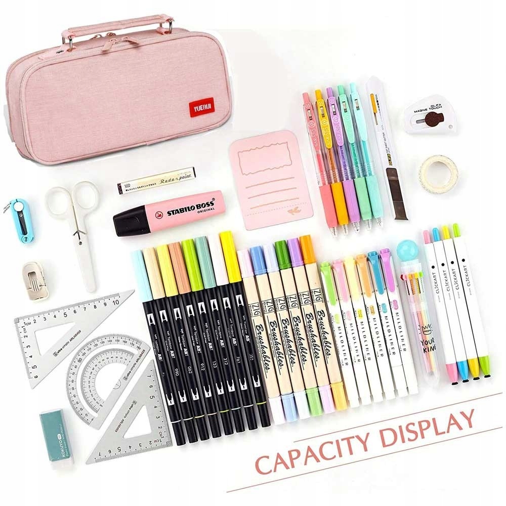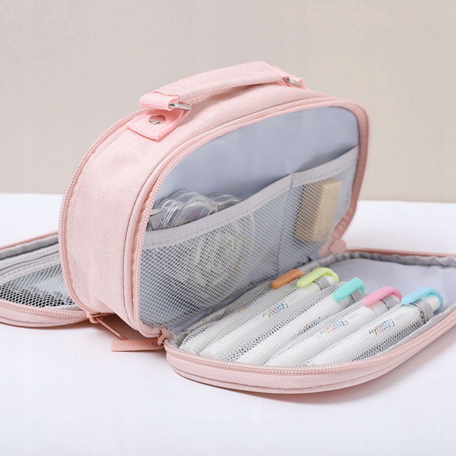 Tkaninasta torbica z dvema zapiraloma in različnimi predali za organizirano shranjevanje svinčnikov, flomastrov in pripomočkov.