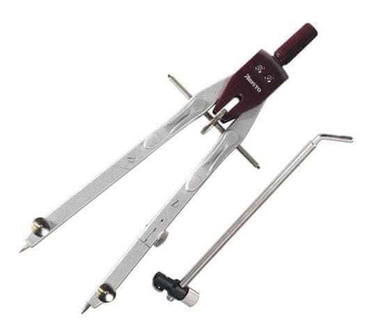 Z zgibom na vsaki nogi. Hitro nastavljanje zaradi mehanizma s sredinskim kolescem. Zamenljiv vstavek za minco. Dolžina 170 mm. Premer kroga do 320 mm. V škatlici za shranjevanje z rezervnimi mincami, nastavkom za pisalo in dodatnim podaljškom. Celoten opis
