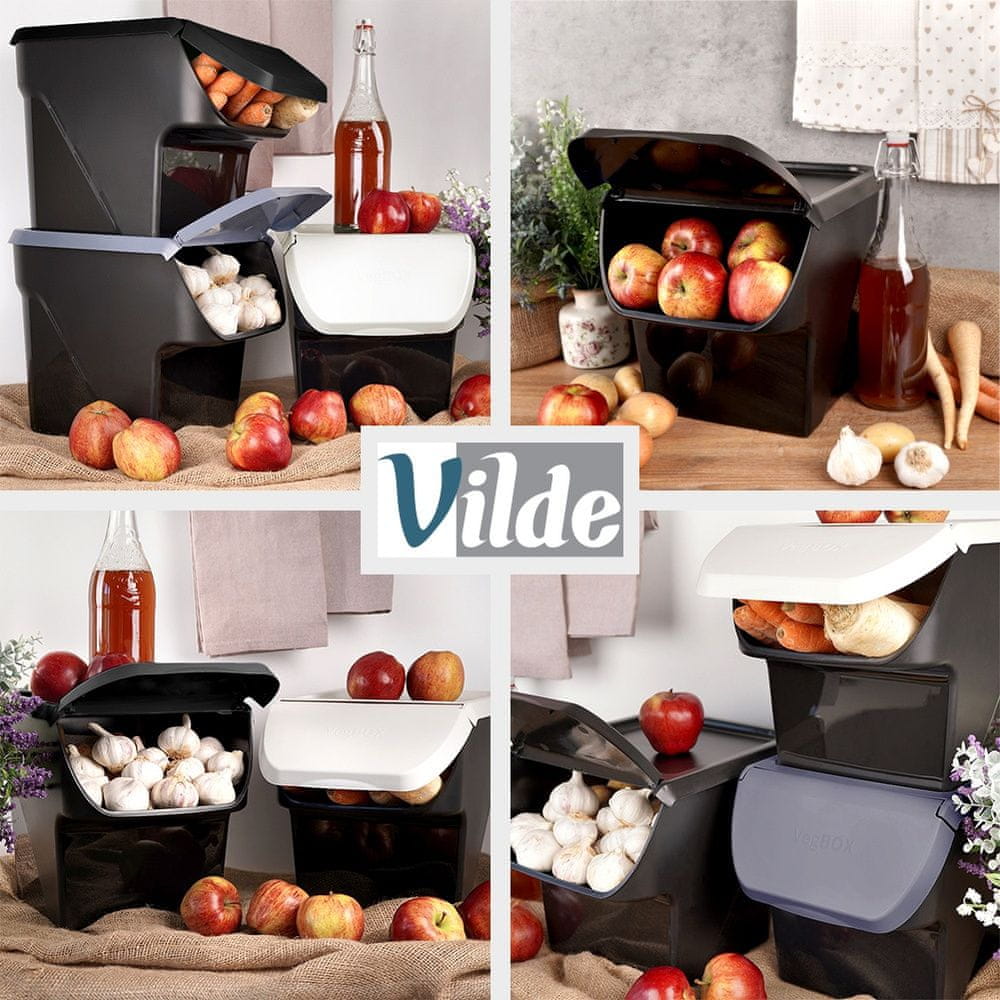 Posode za sadje in zelenjavo. Uporabljajo se lahko tudi za sortiranje odpadkov ali shranjevanje predmetov doma ali v garaži. Elegantne barve, lahke in udobne za uporabo. Snemljivi pokrovi imajo tečajne lopute, zaradi česar jih je enostavno polniti in čistiti. Originalni izdelek Vilde. Izdelano v skladu z evropskimi standardi.