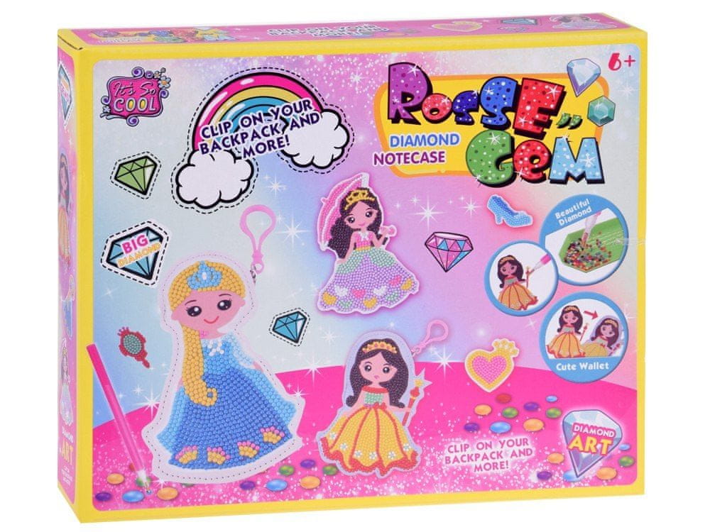 Komplet za diamantno vezenje vam omogoča ustvarjanje čudovitih okraskov z uporabo pravljično pisanih diamantov. Komplet vključuje etui/denarnico z zadrgo in obeskom, sliko nalepke ter lepljenje elementov in dodatkov. Zabava vključuje izbiro ustreznih barv diamantov in njihov prenos na lepilno predlogo s posebnim pisalom. Po razporeditvi elementov ustvarite čudovito, sijočo nalepko, ki jo lahko uporabite za okrasitev obeska za ključe. To barvito dekoracijo lahko pritrdite na nahrbtnik, shranjene ključe ali majhne kovance.