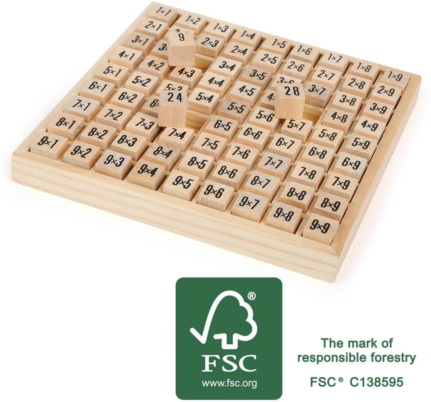 81 lesenih blokov v okvirju iz masivnega lesa. Na kockah so primeri in rezultati, poleg tega pa so nanjih tudi 4 prosta mesta za dodatne matematične uganke. Čudovit način, da se otroci učijo med igro. Glavne značilnosti: razvija logiko spodbuja vadbo malih tablic za množenje izdelan iz 100 % lesa FSC Oznaka in certifikat FSC (Forest Stewardship Council) zagotavljata, da les, iz katerega je bil izdelek izdelan, ni bil nezakonito posekan in prihaja iz gozdov, s katerimi se gospodari na trajnosten ali naravi prijazen način, pri čemer se upoštevajo stroge okoljske in socialne zahteve. Oznaka FSC na izdelku pomeni, da z nakupom prispevate k varstvu gozdov in podpirate trajnostno, odgovorno ali naravi prijazno gospodarjenje, zaradi katerega so naši gozdovi stabilnejši, bolj zdravi, z naravno sestavo vrst in bolje kljubujejo negativnim učinkom podnebnih sprememb.
