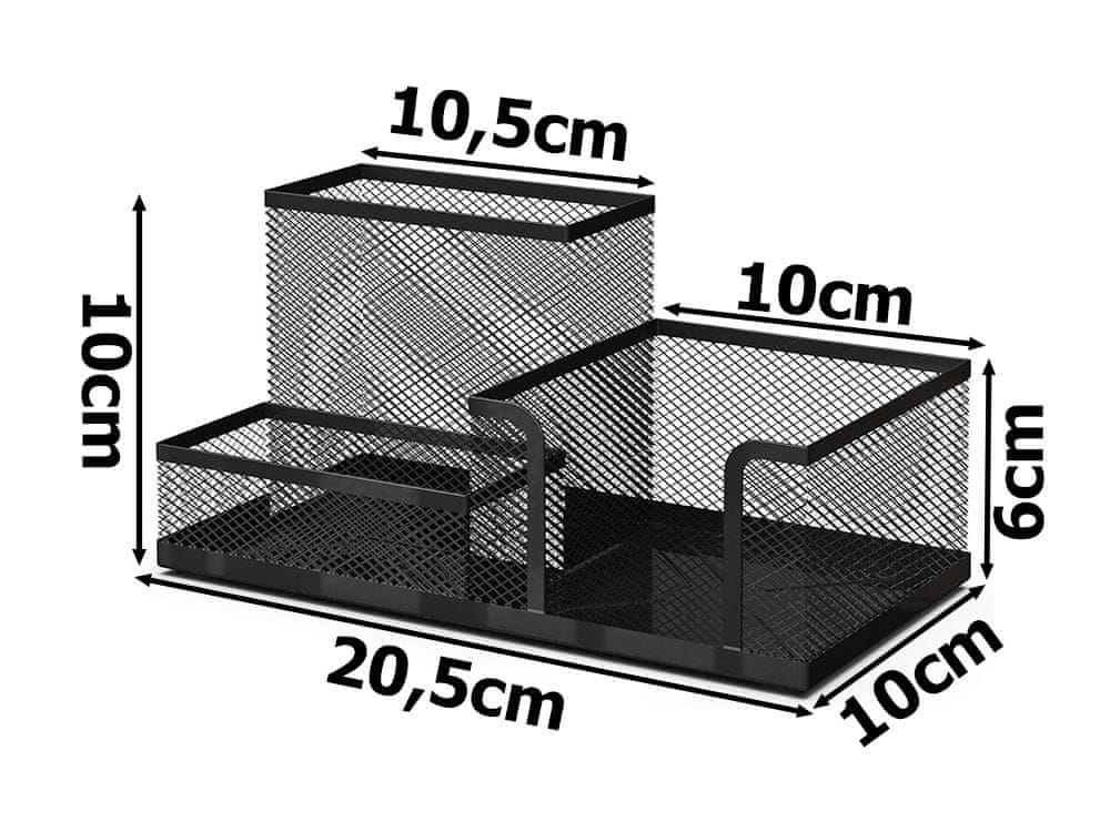 Namizni organizator z lahko mrežasto kovinsko strukturo, kot nalašč za uporabo doma, v pisarni itd. Organizator ima tri prostorne predale, ki vam omogočajo organiziranje vseh vrst pisarniškega materiala. Zahvaljujoč temu boste imeli vse pri roki, kar vam bo omogočilo, da se osredotočite na delo in povečate produktivnost.