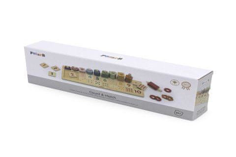 Drevesna igra za učenje štetja do deset. Igra vključuje tablo, stojala, namenjena nanizanju določenega števila različnih oblik, kocke s številkami in kocke s slikami. Dimenzije igre 36,5×11,4×8,5 cm. Dimenzije paketa približno 37×13×6 cm. Starost 3+