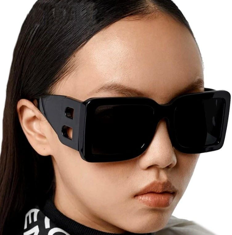 Odkrijte naše velike ženske sončne očala v elegantni črni barvi, ki popolnoma kombinirajo stil in funkcionalnost. Ta očala so izdelana iz kakovostne plastike, kar zagotavlja lahkost in udobje pri nošenju. Pravokotna oblika očal in dimenzije (širina nosnega mostička 14 mm, dolžina stebla 150 mm, širina leč 53 mm x 45 mm) dodajajo sodoben videz, ki odlično dopolni vašo obleko.