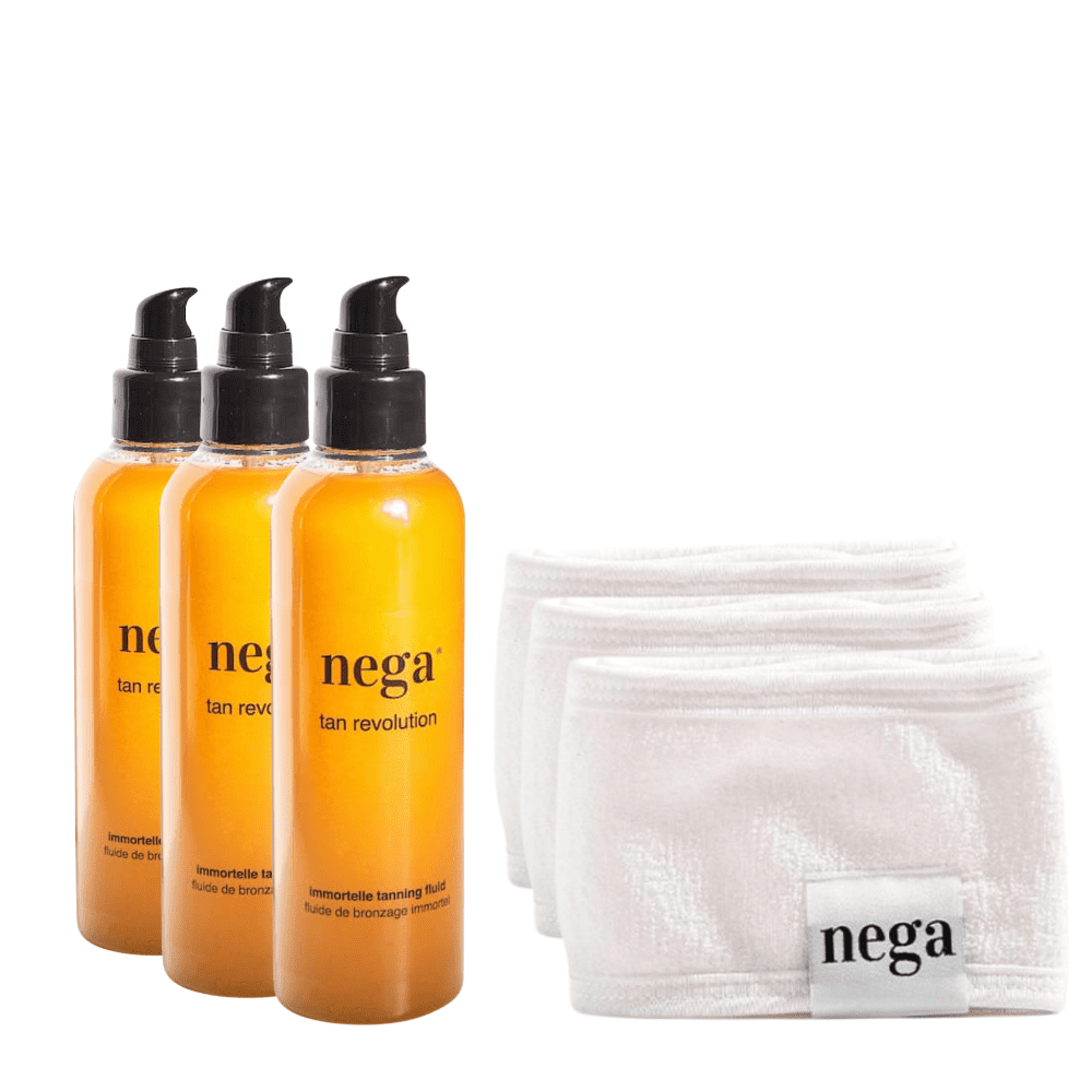 Nega Cosmetics Komplet 3xTan revolution, 100% naravni fluid za hitrejšo naravno porjavitev in 3xtrak za zaščito las, vegansko olje za sončenje, krema za sončenje, gladka koža, prijeten vonj, 3x150 ml, NegatanPaket