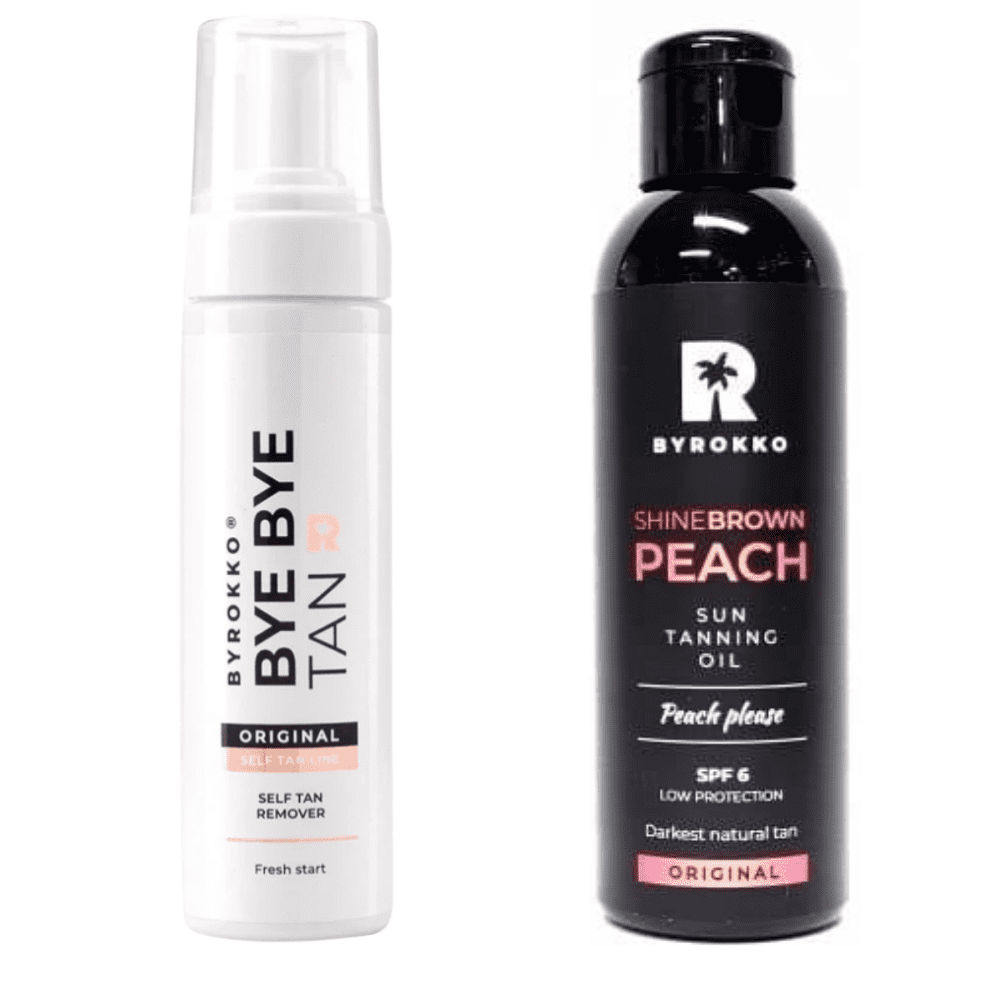 Byrokko Shine Brown SPF6 + Odstranjevalec samoporjavitve Byrokko Shine Brown Peach olje za sončenje 150 ml Dosezite naslednjo stopnjo naravnega brona z našo formulo Shine Brown, izboljšano za leto 2020, ki zagotavlja ekstremne rezultate porjavitve, hidratacijo naslednje stopnje, regeneracijo kože in bogat, temen sijaj. Vrhunska mešanica 100% naravnih olj BYROKKO za ljubitelje ultra temne porjavelosti! Pričakujte izjemno hitre, super temne rezultate na soncu ali na ležalniku. Močan in svež vonj pomaranč. Vrhunska veganska formula brez parabenov. Lahek, nemasten, hitro vpojen in nanos brez madežev. To sezono sončenja smo izboljšali formulo Shinebrown™ za doseganje popolnega, bogatega, temnega sijaja z dodajanjem: kokosovega olja (neguje in ščiti vašo kožo), orehovega olja (da vam bogat, zlat sijaj), lešnikovega olja (ščiti vašo kožo pred UV žarki). Ta izdelek nima UV zaščite. Ne priporočamo uporabe tega izdelka pri otrocih ali tistih z zelo občutljivo kožo. Tistim z zelo svetlo kožo priporočamo uporabo SPF pred uporabo Shine Brown Oil. Ni za interno uporabo! Izogibajte se soncu med 11.00 in 16.00. S ShineBrown Oil dobite vse v steklenički! Lahka kot zrak, svilnato gladka in nemastna tekstura. Hitro vpojna, brezbarvna formula. Bogat, ultra temno rjav sijaj. Izjemno mehka in svilnata koža. Olje nanesite pred vsakim sončenjem. Med sončenjem pijte veliko vode. Jejte veliko sadja. Ko dosežete to čudovito porjavelost, poskrbite, da bo obstojna še dlje z ByRokko Aloe Vera ali Aftersun Byrokko Bye Bye Tan odstranjevalcem samoporjavitve 200 ml. Najhitrejši in najučinkovitejši način za odstranjevanje umetne porjavelosti ali pripravo kože na svežo samoporjavitveno peno. Ta lahka čistilna pena je primerna za vse tipe kože in brez težav odstrani umetno porjavelost, kožo pa pusti svilnato gladko in navlaženo. Primerno za obraz in telo. Sestavine, ki ne dražijo. Primerno za vse tipe kože. Najučinkovitejši način za odstranjevanje umetne porjavelosti ali pripravo na svežo porjavelost. Ta lahka pena je primerna za uporabo na obrazu in telesu za vse tipe kože. Z lahkoto odstrani umetno porjavelost, kožo pa pusti svilnato gladko in navlaženo. Edinstvena čistilna formula BYROKKO učinkovito odstrani porjavelost, vlaži in kožo naredi svilnato gladko. Znebite se porjavelosti, kopičenja ali stare porjavelosti v treh preprostih korakih. Kako uporabiti: Najprej izdatno nanesite Bye Bye Tan Remover na predele, kjer je potrebna odstranitev porjavelosti. Pustite delovati vsaj 5 minut. Nato se oprhajte s toplo vodo in z mokro krpo za obraz obrišite porjavelost. Ta odstranjevalec porjavelosti vsebuje negovalne sestavine, ki so nežne do kože, obenem pa odlično pripravijo obraz in telo na brezhiben nanos pene za porjavelost. Edinstvena čistilna formula BYROKKO učinkovito odstrani porjavelost, vlaži in kožo naredi svilnato gladko.