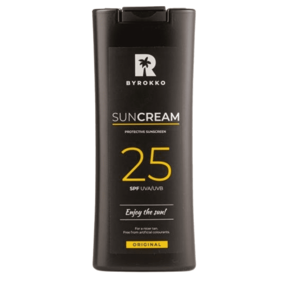 Byrokko Sun Cream zaščitna krema za sončenje 25 SPF UVA/UVB. Krema za sončenje Byrokko vlaži vašo kožo in zagotavlja UVA/UVB zaščito pred soncem. Ustvarjen za vsakogar, še posebej za tiste s svetlo in nežno kožo. Hitro vpojna in čudovito dišeča krema za sončenje z zaščitnim faktorjem 25, ki deluje kot vlažilna krema in neguje vašo kožo, medtem ko uživate na soncu. UVA/UVB krema z zaščito pred soncem. Svež in bogat tropski vonj. Odlično se ujema s kremo ali oljem ShineBrown™. Ta ultra lahka in nemastna mešanica izpolnjuje le naše najvišje standarde kakovosti BYROKKO! Karitejevo maslo nahrani vašo kožo. Vitamin E, močan antioksidant, jo navlaži. Abiflavon deluje protivnetno in pospešuje regeneracijo kože (predvsem opečene kože). Opozorilo: Kreme za sončenje ne zagotavljajo 100-odstotne zaščite pred UV žarki. Prekomerno izpostavljanje soncu lahko resno škoduje vašemu zdravju. Tudi ko uporabljate zaščito pred soncem, se izogibajte dolgotrajni izpostavljenosti sončni svetlobi in jo večkrat ponovite, da ohranite zaščito. Samo za zunanjo uporabo. Izogibajte se stiku z očmi. Izogibajte se izpostavljanju soncu med 11.00 in 16.00 uro. Kako uporabiti: Nanesite BYROKKO SPF 25. Na vrh nanesite Shine Brown (neobvezno). Ostanite dobro hidrirani in uživajte na soncu!