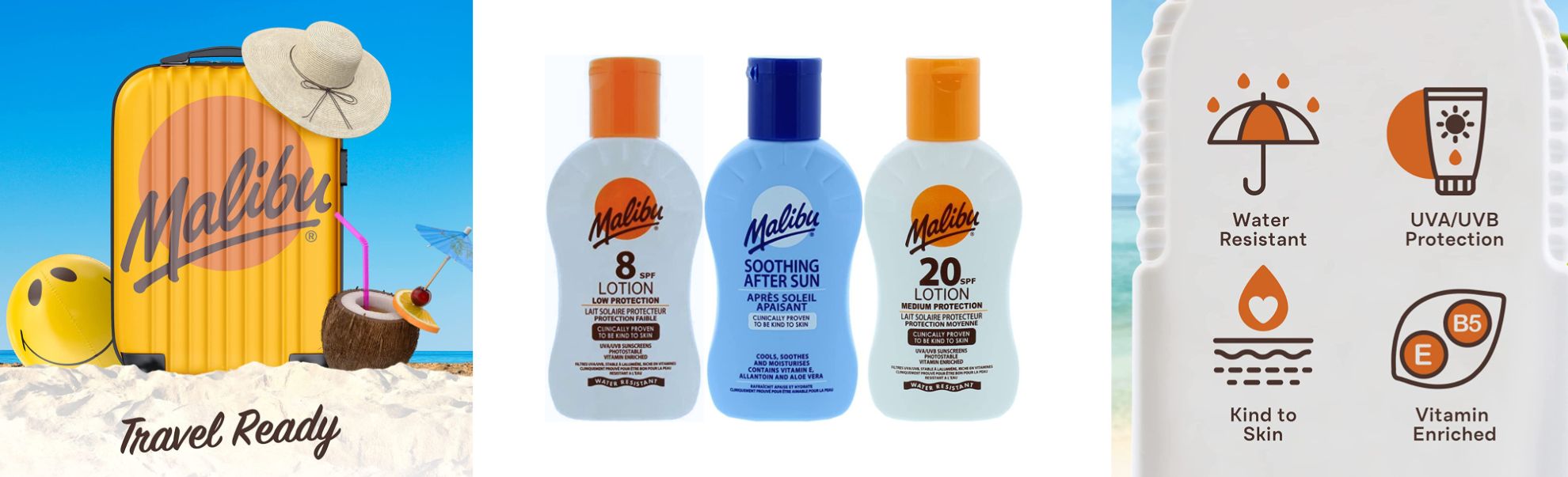 Malibu Travel Pack Losjoni za zaščito pred soncem SPF8 SPF20 + Losjon za po sončenju Malibu za zaščito pred soncem so vodoodporni, se zlahka razmažejo in hitro vpijejo. Ponujajo odlično zaščito pred naravnim soncem, hkrati pa zagotavljajo fantastično nego kože. UVA/UVB filtri z visoko zaščito Fotostabilno Klinično dokazano nežno do kože Vsebuje vitamin E in aloe vero Vodoodporno Testirano samo na ljudeh Izdelano v Angliji Navodila: Nanesite 30 minut pred in pogosto med izpostavljanjem soncu. Prepričajte se, da je vsa izpostavljena koža enakomerno in izdatno prekrita z losjonom. Če losjon preneha delovati, ga večkrat nanesite. Senco poiščite med 11.00 in 15.00 uro. Samo za zunanjo uporabo. Ne nanašajte na poškodovano kožo. Izogibajte se stiku s tkaninami in očmi. V primeru stika z očmi sperite s čisto vodo. Vodoodporni losjon za sončenje Malibu vsebuje vitamin E in izvleček aloe vere. Ta losjon zagotavlja učinkovito in učinkovito UVA/UVB zaščito ter preprečuje sončne opekline. Njegova lahka, nemastna formula se hitro vpije, ne da bi pustila lepljive ostanke. Set vsebuje: Vodoodporen losjon za sončenje Malibu Lotion SPF8 100 ml; Vodoodporen losjon za sončenje Malibu Lotion SPF20 100 ml; in Malibu pomirjujoči losjon po sončenju 100 ml.