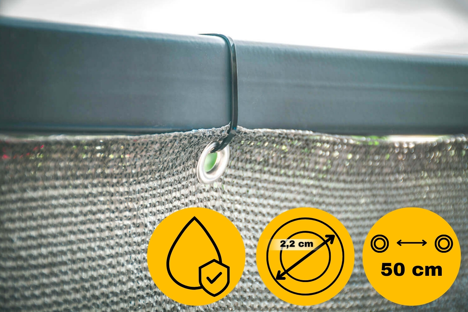 , ki so všita na vsakih 50 cm, zagotavljajo __HtM1P14CEhO1D3R___ hitro in stabilno namestitev pokrova . ⭕️ Pokrov lahko namestite tudi z uporabo kabelskih vezic , ki jih najdete v naših drugih ponudbah! ▶️ SPECIFIKACIJA