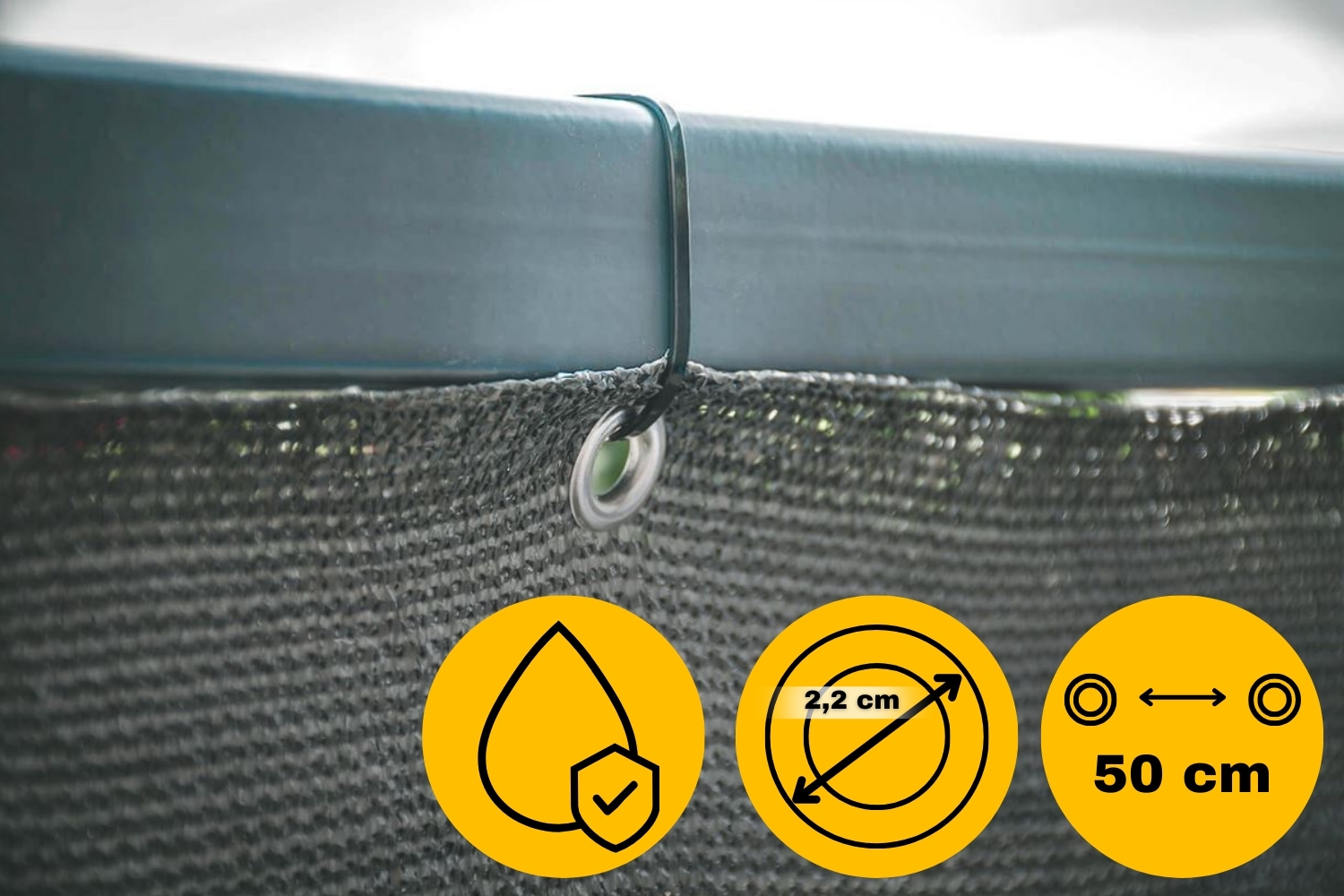 , ki so všita na vsakih 50 cm, zagotavljajo __HtM1P14CEhO1D3R___ hitro in stabilno namestitev pokrova . ⭕️ Pokrov lahko namestite tudi z uporabo kabelskih vezic , ki jih najdete v naših drugih ponudbah! ▶️ SPECIFIKACIJA