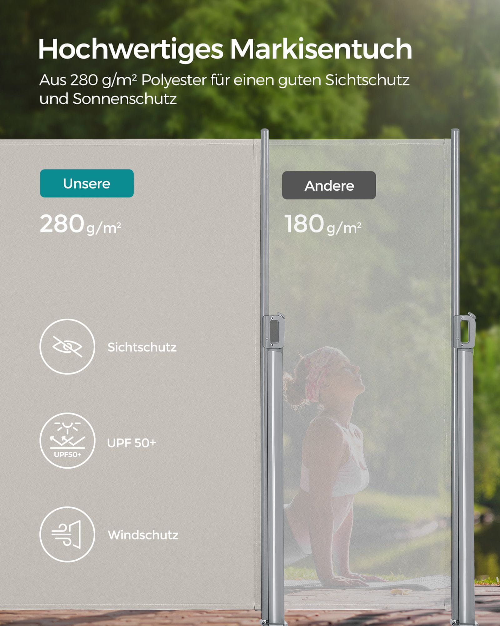 Ta stranska tenda ponuja praktično rešitev za večjo zasebnost ter zaščito pred soncem in vetrom na balkonih, terasah, verandah in vrtovih. Zasnovana z modernim videzom, je enostavna za izvlek in zlaganje, kar zagotavlja udobje in vsestranskost za zunanje prostore. Trpežna konstrukcija in vremensko odporni materiali zagotavljajo dolgo življenjsko dobo in učinkovito zaščito pred vremenskimi vplivi.