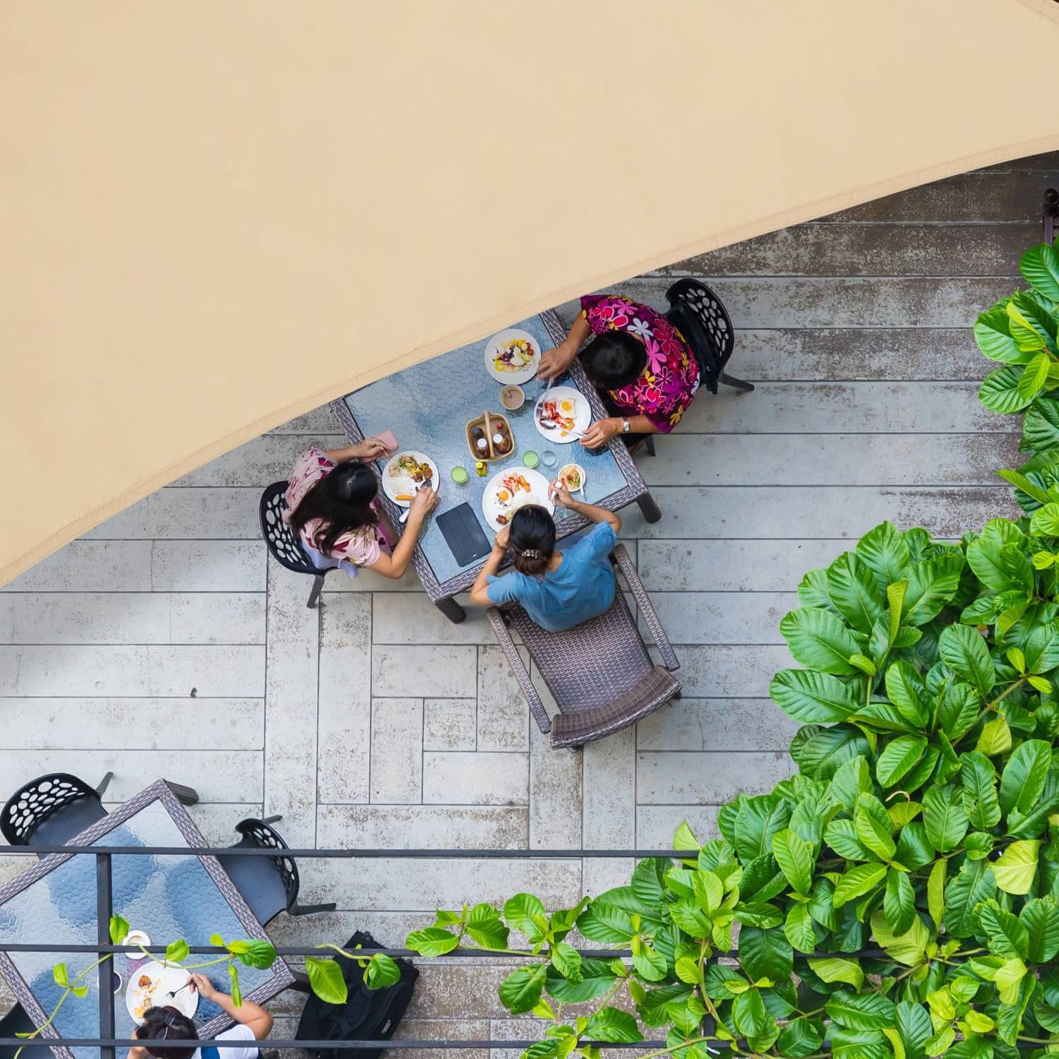 Jadro s senčnikom ponuja hladilno senco in UV zaščito, popolno za terase in balkone. Ta vodoodbojna tkanina zagotavlja udobje tudi v najbolj vročih dneh.