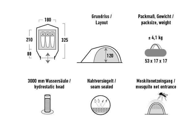 Šotor High Peak Nevada 31 ima 3000 mm vodnega stolpca, ki zagotavlja suho notranjost, tudi v slabih vremenskih pogojih. Ima eleganten in funkcionalen vhod in zagotavlja dovolj prostora za udobno bivanje. Izjemno močni 5 mm jekleni klini se lahko uporabijo tudi na trdih tleh. Palice so barvno označene za lažjo postavitev, zelene obrobe so vidne v zori in mraku. Notranji šotor je opremljen s sistemom High Peak Vario Vent Control. Na vhodu ima mrežo proti insektom. Notranji šotor ima žepe za pripomočke in nosilec za svetilko. Šivi so vodotesno varjeni. Šotor je odličen za daljši dopust ali za vikend avanturo.