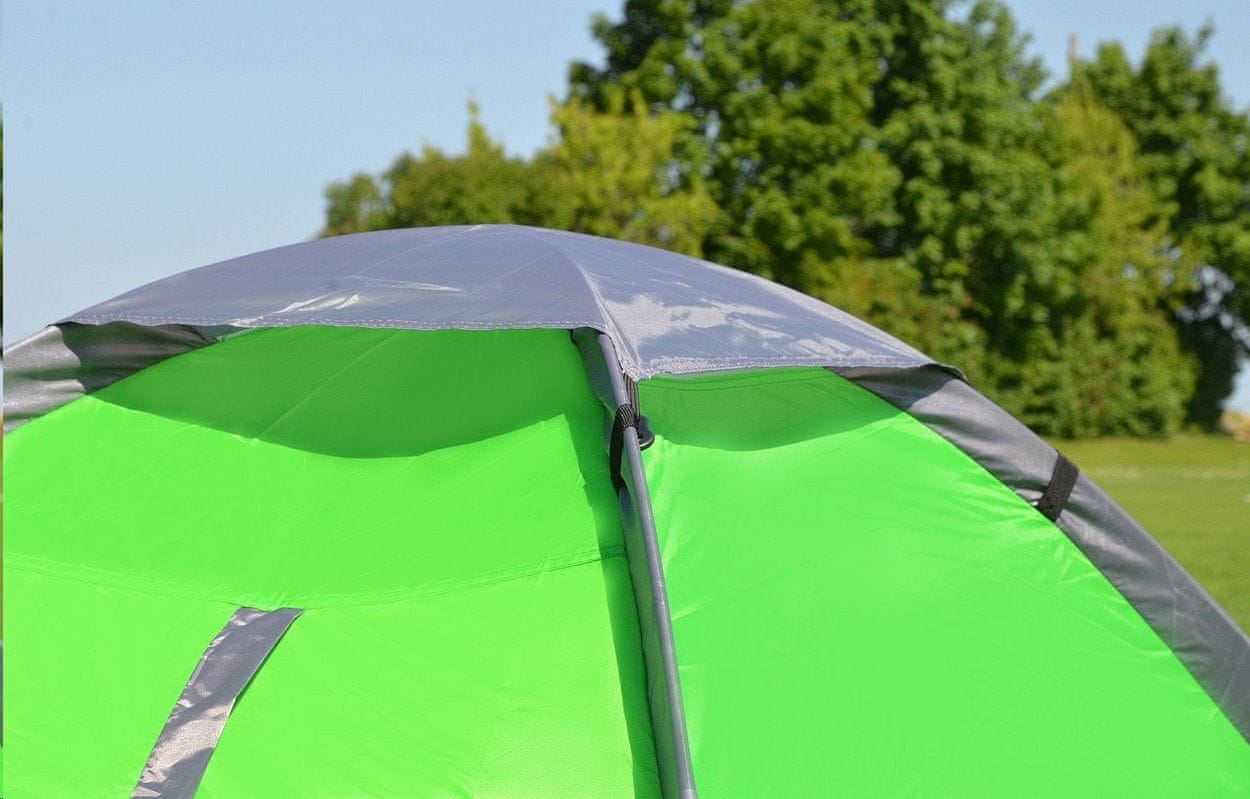 Material šotora je vodoodporen, preizkušen s 1500 mm vodnega stolpca (PU 1500), tla so ojačana in dvignjena. Nosilne palice so izdelane iz trpežnih steklenih vlaken. Sidranje je izvedeno z žebljički za podstavek in žebljički za odklop šotora z nastavljivimi vrvmi v vogalih šotora.