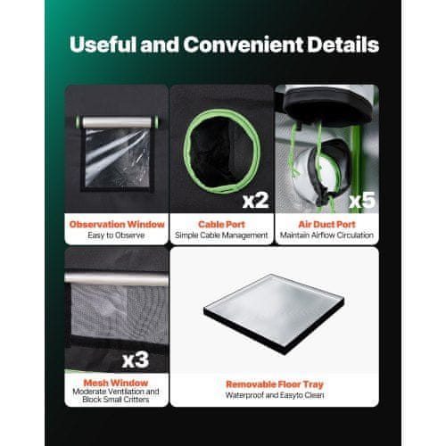 Kompleti za notranjo rastno šotor omogoča nadzorovano okolje za gojenje rastlin v zaprtih prostorih zaradi česar je idealen za gojenje cvetja zelenjave zelišč ali sadja skozi vse leto. Ta šotor vam omogoča upravljanje svetlobe temperature in vlage za optimizacijo zdravja rastlin in pridelka. Oblikovan za priročnost in vzdržljivost ima odsevno notranjost robusten okvir in premišljene dostopne točke za enostavno opazovanje in vzdrževanje.