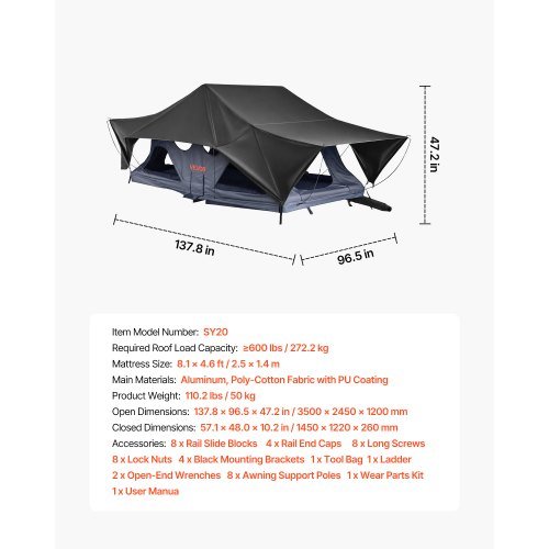 Ta zložljiva strešna šotor nudi praktično in udobno rešitev za ljubitelje narave ki iščejo hitro in varno zavetje na svojem vozilu. Namenjen je za SUV-je Jeep-e in pickup vozila ima ojačano aluminijasto ogrodje in trpežno poli-bombažno tkanino za zanesljivo zaščito pred vremenskimi vplivi. Prostoren notranji prostor debela vzmetnica in več oken zagotavljajo prijetno kampiranje medtem ko priložena teleskopska lestev omogoča enostaven dostop.