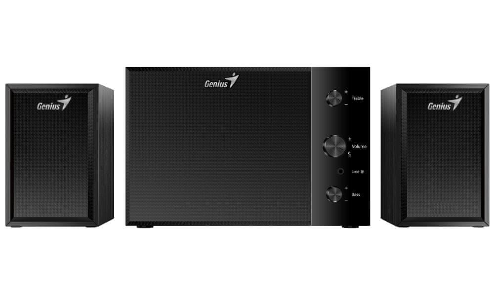 Sodoben sistem zvočnikov Genius SW-2.1 350 v konfiguraciji 2.1 je primeren za poslušanje glasbe, ozvočenje filmov, videoposnetkov ali računalniških iger. Zaradi elegantne zasnove so zvočniki odlično videti na vaši mizi. Skupna moč 15 W (RMS) bo zagotovila zmogljiv zvok za večpredstavnostne vsebine. Prisotnost 3,5-milimetrskega priključka omogoča priključitev dodatnih naprav. 4-palčni globokotonec ustvarja zvok s primernimi nizkimi toni, lesena konstrukcija pa podpira naraven zvok brez popačenja. Upravljalniki na sprednji strani omogočajo enostavno prilagajanje glasnosti.