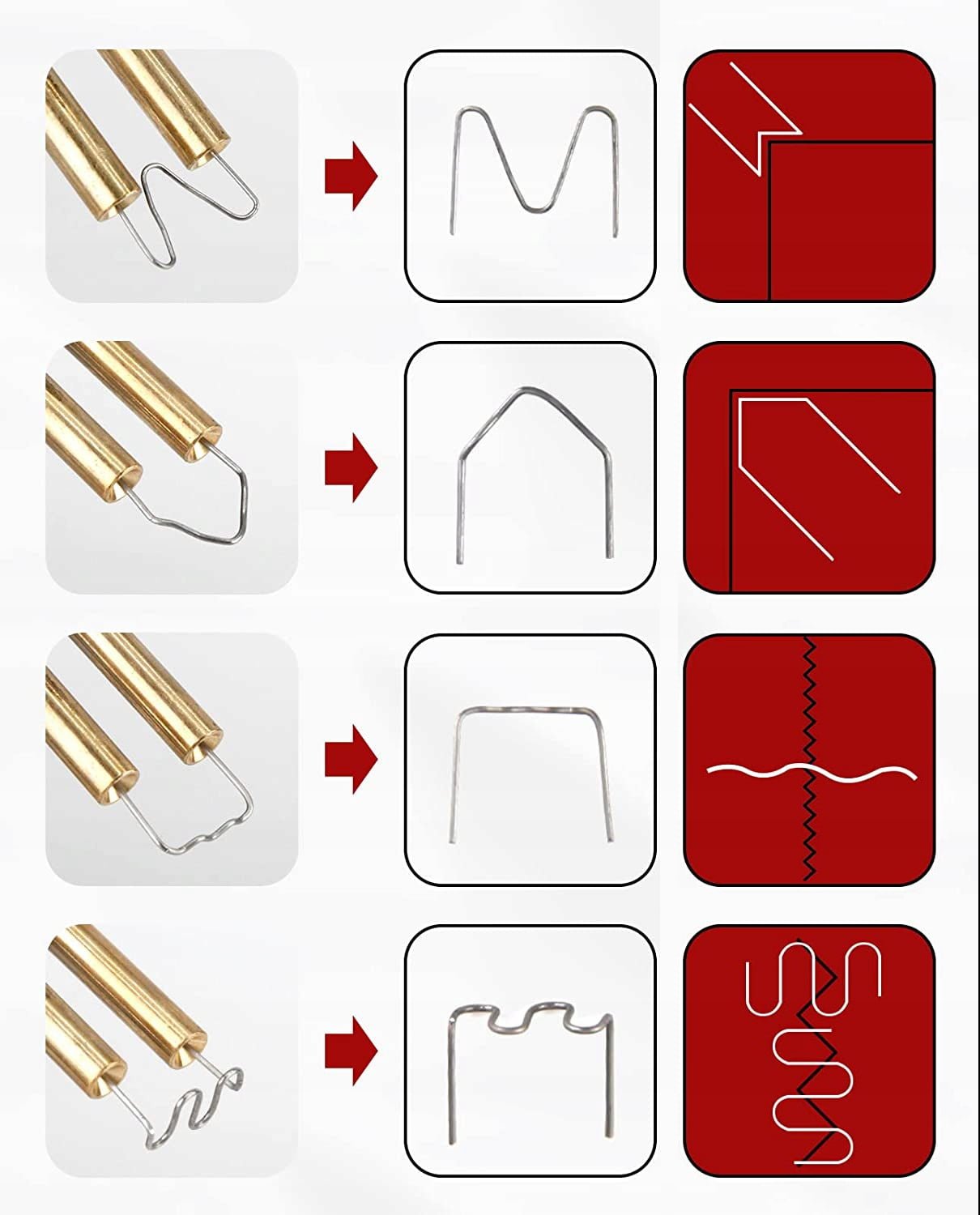 Zahvaljujoč obliki konic lahko izvajate površinsko varjenje za povezovanje razpok ali jih uporabite kot sponke. Če želite to narediti, potopite konico čez razpoko in jo odstranite iz varilnih vilic. Ko se plastika ohladi, upognite štrleče konce tako, da se odlomijo poravnano s površino zvara.