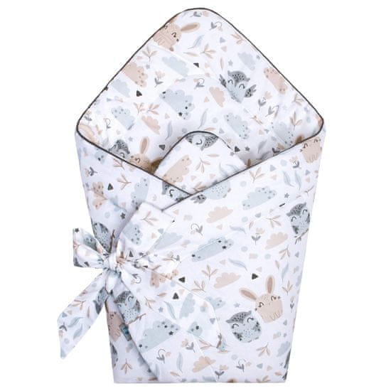 Bombažni rog iz kolekcije FRIENDS FOREST je povezan s trakom, ki omogoča prilagajanje velikosti otroka in stopnji zavijanja. Gre za varno in udobno obliko zapenjanja, ki v našem izdelku izključuje uporabo trdih elementov, kot je velcro, ki bi lahko razdražili občutljivo otroško kožo.